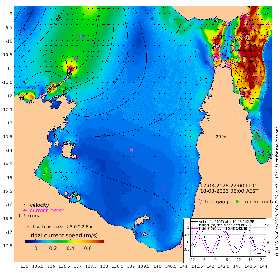 22cm/s 123T +3cm/s rms + 7cm/s -42T. ARA-GOC87 57m 16cm/s 170T +3cm/s rms + 2cm/s -2T. ARA-GOC87 60m 19cm/s 123T +2cm/s rms + 3cm/s 61T. ARA-GOC87 47m 72cm Daru 77cm Bobo Island 106cm Meer Island Barge 118cm Bramble Cay 107cm Unnamed Cay 99cm Pearce Cay 110cm Stephens Island 116cm Merrie England Shoals 86cm Mutacomal Reef 103cm Darnley Island Barge 114cm East Cay 84cm Yorke Island Barge 90cm Rennel Island 71cm Aureed Island 58cm Dungeness Reef -9cm Zagai Island 6cm Yam Island -48cm Dauan Island -55cm Saibai Island -48cm Phipi Reef -12cm Warrior Reef - West -28cm Mabuiag Island Barge 93cm Half Way Island 52cm Coconut Island 83cm Dugong Islet 33cm Poll Island 45cm Kirkcaldie Reef -9cm Suarji Island 24cm Sue Islet 49cm Hawkesbury Island 10cm Alert Patches 12cm Twin Island 20cm Badu Island -6cm St Pauls (Moa Island) 31cm Kubin (Moa Island) 7cm Ince Point 11cm Thursday Island 7cm Nardana Patches 24cm Turtle Head 20cm Round Island 48cm Goods Island 46cm Booby Island 53cm White Rocks Area 22cm Carpentaria 3cm Papou Point 41cm Bampfield Head 25cm Crab Island 41cm Red Wallis Island 37cm Packe Island 75cm Harrington Reef 31cm Herald Camp -20cm Sharp Point 17cm Red Island Point 4cm Possession Island 18cm Alpha Rock 36cm Frederick Point 75cm Wyborn Reef Light 62cm Tetley Island 80cm Triangle Reef 96cm Turtle Head Island 100cm Maclennan Cay 99cm Raine Island 97cm Mcsweeny Reef 96cm Collette Reef 95cm Shadwell Reef 111cm Hannibal Island 122cm Round Point 24cm Vrilya Point 113cm Cape Grenville 110cm Hicks Island 116cm Sir Charles Hardy Island 34cm Harvey Island 121cm Kay Reef 106cm Rocky Island 103cm Chapman Island 100cm Ham Reef 106cm Jubilee Reef 93cm Night Island 102cm Unnamed Reef No. 3 114cm Morris Island 108cm 1st 3 Mile Opening 108cm Creech Reef 108cm Fife Island 135cm Eden Reef 121cm Stanley Island 135cm Normanby River 159cm Yabooma Island 175cm Hutchison River 143cm Elcho Island 136cm North West Crocodile Island 103cm Cape Wessel 136cm Stevens Island 102cm Guluwuru Island 119cm Hopeful Bay 111cm Auster Point 119cm Two Island Bay 154cm Cadell Strait 106cm Mallison Island 86cm Melville Bay (Gove Harbour) 92cm Truant Island 48cm Cape Arnhem 20cm Cape Grey -6cm Hawk Island -40cm Milner Bay (Groote Eylandt) -40cm Cape Beatrice -79cm West Island -92cm Centre Island -86cm Mornington Island -74cm West Wellesley Islands -75cm Bountiful Island -102cm Albert River Mouth -122cm Sweers Island -110cm Karumba -43cm Nassau River Offshore -14cm Christmas Creek 12cm Archer River 18cm Boyd Point 26cm Weipa (Humbug Point) 13cm Pennefather River 15cm Cullen Point