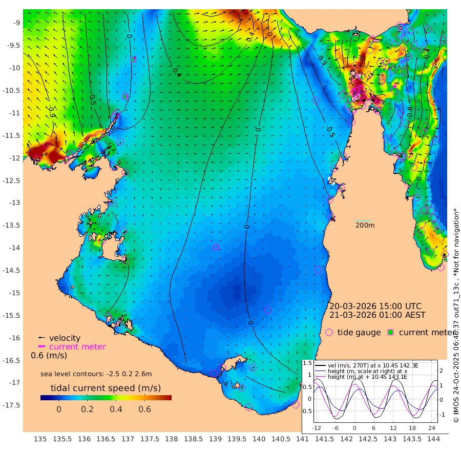 22cm/s 78T +3cm/s rms + 7cm/s -42T. ARA-GOC87 57m 6cm/s 64T +3cm/s rms + 2cm/s -2T. ARA-GOC87 60m 21cm/s 61T +2cm/s rms + 3cm/s 61T. ARA-GOC87 47m 109cm Daru 102cm Bobo Island 23cm Meer Island Barge 45cm Bramble Cay 81cm Unnamed Cay 78cm Pearce Cay 67cm Stephens Island 75cm Merrie England Shoals 100cm Mutacomal Reef 65cm Darnley Island Barge 21cm East Cay 87cm Yorke Island Barge 82cm Rennel Island 92cm Aureed Island 98cm Dungeness Reef 123cm Zagai Island 105cm Yam Island 91cm Dauan Island 95cm Saibai Island 109cm Phipi Reef 120cm Warrior Reef - West 57cm Mabuiag Island Barge 79cm Half Way Island 108cm Coconut Island 87cm Dugong Islet 103cm Poll Island 98cm Kirkcaldie Reef 110cm Suarji Island 107cm Sue Islet -56cm Hawkesbury Island 86cm Alert Patches 89cm Twin Island -18cm Badu Island 99cm St Pauls (Moa Island) -7cm Kubin (Moa Island) 55cm Ince Point 32cm Thursday Island 40cm Nardana Patches 0cm Turtle Head -9cm Round Island -57cm Goods Island -87cm Booby Island -82cm White Rocks Area -71cm Carpentaria 77cm Papou Point -55cm Bampfield Head -71cm Crab Island -82cm Red Wallis Island -31cm Packe Island 104cm Harrington Reef -53cm Herald Camp 39cm Sharp Point -7cm Red Island Point 56cm Possession Island 89cm Alpha Rock 98cm Frederick Point 110cm Wyborn Reef Light 112cm Tetley Island 30cm Triangle Reef 101cm Turtle Head Island 18cm Maclennan Cay -4cm Raine Island 75cm Mcsweeny Reef 66cm Collette Reef 29cm Shadwell Reef 70cm Hannibal Island 43cm Round Point -73cm Vrilya Point 34cm Cape Grenville 28cm Hicks Island 21cm Sir Charles Hardy Island 11cm Harvey Island 15cm Kay Reef 5cm Rocky Island -5cm Chapman Island -6cm Ham Reef 3cm Jubilee Reef 8cm Night Island -7cm Unnamed Reef No. 3 3cm Morris Island 0cm 1st 3 Mile Opening 1cm Creech Reef 5cm Fife Island -8cm Eden Reef 0cm Stanley Island -3cm Normanby River -85cm Yabooma Island -70cm Hutchison River -74cm Elcho Island -80cm North West Crocodile Island -9cm Cape Wessel -35cm Stevens Island 45cm Guluwuru Island -42cm Hopeful Bay -20cm Auster Point -27cm Two Island Bay -22cm Cadell Strait 161cm Mallison Island 34cm Melville Bay (Gove Harbour) 38cm Truant Island 39cm Cape Arnhem 36cm Cape Grey 36cm Hawk Island 29cm Milner Bay (Groote Eylandt) 17cm Cape Beatrice 18cm West Island 22cm Centre Island 30cm Mornington Island 21cm West Wellesley Islands 18cm Bountiful Island 9cm Albert River Mouth 34cm Sweers Island 12cm Karumba 1cm Nassau River Offshore -11cm Christmas Creek -38cm Archer River -40cm Boyd Point -57cm Weipa (Humbug Point) -39cm Pennefather River -65cm Cullen Point