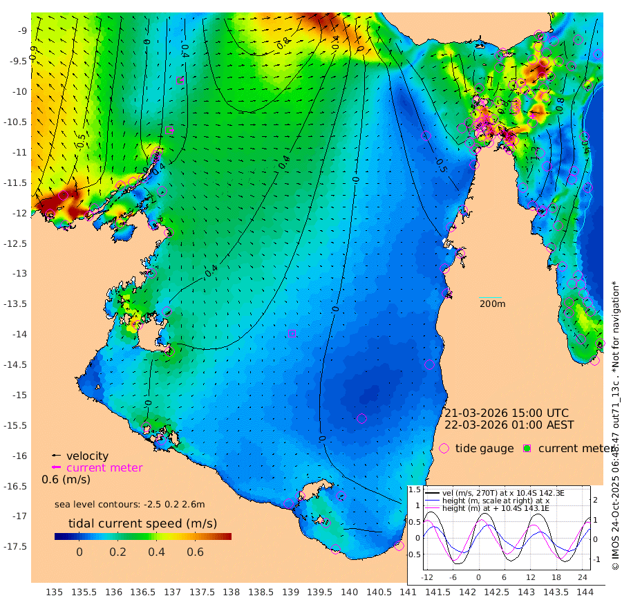 32cm/s 94T +3cm/s rms + 7cm/s -42T. ARA-GOC87 57m 7cm/s 134T +3cm/s rms + 2cm/s -2T. ARA-GOC87 60m 28cm/s 78T +2cm/s rms + 3cm/s 61T. ARA-GOC87 47m 123cm Daru 119cm Bobo Island 54cm Meer Island Barge 74cm Bramble Cay 101cm Unnamed Cay 103cm Pearce Cay 94cm Stephens Island 96cm Merrie England Shoals 111cm Mutacomal Reef 91cm Darnley Island Barge 52cm East Cay 106cm Yorke Island Barge 100cm Rennel Island 109cm Aureed Island 110cm Dungeness Reef 119cm Zagai Island 102cm Yam Island 86cm Dauan Island 80cm Saibai Island 105cm Phipi Reef 118cm Warrior Reef - West 45cm Mabuiag Island Barge 99cm Half Way Island 117cm Coconut Island 102cm Dugong Islet 106cm Poll Island 103cm Kirkcaldie Reef 102cm Suarji Island 105cm Sue Islet -46cm Hawkesbury Island 81cm Alert Patches 85cm Twin Island -11cm Badu Island 92cm St Pauls (Moa Island) 2cm Kubin (Moa Island) 52cm Ince Point 31cm Thursday Island 38cm Nardana Patches 7cm Turtle Head -6cm Round Island -42cm Goods Island -72cm Booby Island -69cm White Rocks Area -69cm Carpentaria 73cm Papou Point -46cm Bampfield Head -58cm Crab Island -70cm Red Wallis Island -19cm Packe Island 115cm Harrington Reef -43cm Herald Camp 31cm Sharp Point -4cm Red Island Point 52cm Possession Island 82cm Alpha Rock 100cm Frederick Point 118cm Wyborn Reef Light 117cm Tetley Island 52cm Triangle Reef 119cm Turtle Head Island 46cm Maclennan Cay 27cm Raine Island 95cm Mcsweeny Reef 86cm Collette Reef 54cm Shadwell Reef 94cm Hannibal Island 72cm Round Point -63cm Vrilya Point 60cm Cape Grenville 58cm Hicks Island 51cm Sir Charles Hardy Island 20cm Harvey Island 43cm Kay Reef 34cm Rocky Island 24cm Chapman Island 22cm Ham Reef 33cm Jubilee Reef 36cm Night Island 22cm Unnamed Reef No. 3 35cm Morris Island 33cm 1st 3 Mile Opening 33cm Creech Reef 38cm Fife Island 33cm Eden Reef 32cm Stanley Island 33cm Normanby River -35cm Yabooma Island -9cm Hutchison River -25cm Elcho Island -35cm North West Crocodile Island 22cm Cape Wessel 8cm Stevens Island 84cm Guluwuru Island -5cm Hopeful Bay 16cm Auster Point 13cm Two Island Bay 39cm Cadell Strait 197cm Mallison Island 67cm Melville Bay (Gove Harbour) 72cm Truant Island 60cm Cape Arnhem 42cm Cape Grey 36cm Hawk Island 13cm Milner Bay (Groote Eylandt) 1cm Cape Beatrice -16cm West Island -13cm Centre Island 11cm Mornington Island 0cm West Wellesley Islands -4cm Bountiful Island -10cm Albert River Mouth 4cm Sweers Island -9cm Karumba -2cm Nassau River Offshore -4cm Christmas Creek -27cm Archer River -29cm Boyd Point -41cm Weipa (Humbug Point) -29cm Pennefather River -57cm Cullen Point