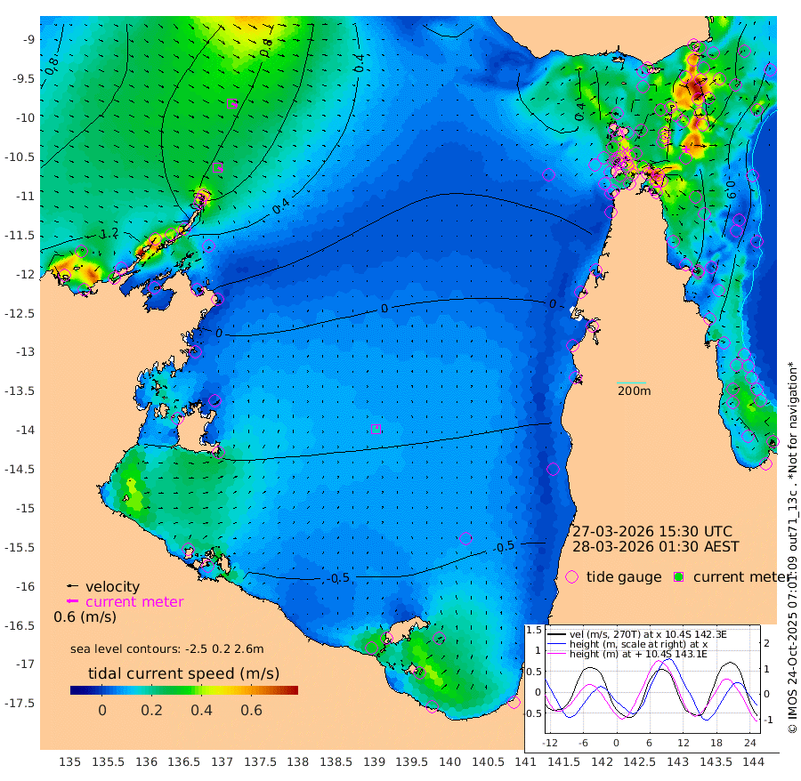 30cm/s 119T +3cm/s rms + 7cm/s -42T. ARA-GOC87 57m 16cm/s 23T +3cm/s rms + 2cm/s -2T. ARA-GOC87 60m 34cm/s 115T +2cm/s rms + 3cm/s 61T. ARA-GOC87 47m -104cm Daru -99cm Bobo Island -73cm Meer Island Barge -95cm Bramble Cay -111cm Unnamed Cay -103cm Pearce Cay -108cm Stephens Island -120cm Merrie England Shoals -113cm Mutacomal Reef -99cm Darnley Island Barge -83cm East Cay -98cm Yorke Island Barge -107cm Rennel Island -98cm Aureed Island -92cm Dungeness Reef -43cm Zagai Island -49cm Yam Island 8cm Dauan Island 13cm Saibai Island -20cm Phipi Reef -50cm Warrior Reef - West 22cm Mabuiag Island Barge -107cm Half Way Island -87cm Coconut Island -107cm Dugong Islet -72cm Poll Island -84cm Kirkcaldie Reef -52cm Suarji Island -66cm Sue Islet 59cm Hawkesbury Island -44cm Alert Patches -44cm Twin Island 61cm Badu Island -33cm St Pauls (Moa Island) 31cm Kubin (Moa Island) -14cm Ince Point 2cm Thursday Island -1cm Nardana Patches 15cm Turtle Head 42cm Round Island 50cm Goods Island 72cm Booby Island 60cm White Rocks Area 70cm Carpentaria -21cm Papou Point 81cm Bampfield Head 62cm Crab Island 61cm Red Wallis Island 28cm Packe Island -112cm Harrington Reef 54cm Herald Camp -15cm Sharp Point 19cm Red Island Point -9cm Possession Island -50cm Alpha Rock -70cm Frederick Point -95cm Wyborn Reef Light -86cm Tetley Island -60cm Triangle Reef -96cm Turtle Head Island -72cm Maclennan Cay -53cm Raine Island -103cm Mcsweeny Reef -99cm Collette Reef -73cm Shadwell Reef -110cm Hannibal Island -99cm Round Point 56cm Vrilya Point -96cm Cape Grenville -83cm Hicks Island -79cm Sir Charles Hardy Island -30cm Harvey Island -85cm Kay Reef -67cm Rocky Island -57cm Chapman Island -55cm Ham Reef -62cm Jubilee Reef -66cm Night Island -60cm Unnamed Reef No. 3 -72cm Morris Island -60cm 1st 3 Mile Opening -67cm Creech Reef -78cm Fife Island -76cm Eden Reef -78cm Stanley Island -86cm Normanby River 137cm Yabooma Island 148cm Hutchison River 135cm Elcho Island 129cm North West Crocodile Island 95cm Cape Wessel 119cm Stevens Island 65cm Guluwuru Island 108cm Hopeful Bay 102cm Auster Point 106cm Two Island Bay 121cm Cadell Strait 11cm Mallison Island 62cm Melville Bay (Gove Harbour) 71cm Truant Island 39cm Cape Arnhem 11cm Cape Grey -6cm Hawk Island -18cm Milner Bay (Groote Eylandt) -41cm Cape Beatrice -74cm West Island -69cm Centre Island -113cm Mornington Island -120cm West Wellesley Islands -116cm Bountiful Island -116cm Albert River Mouth -117cm Sweers Island -121cm Karumba -100cm Nassau River Offshore -72cm Christmas Creek -18cm Archer River 5cm Boyd Point 8cm Weipa (Humbug Point) 17cm Pennefather River 47cm Cullen Point