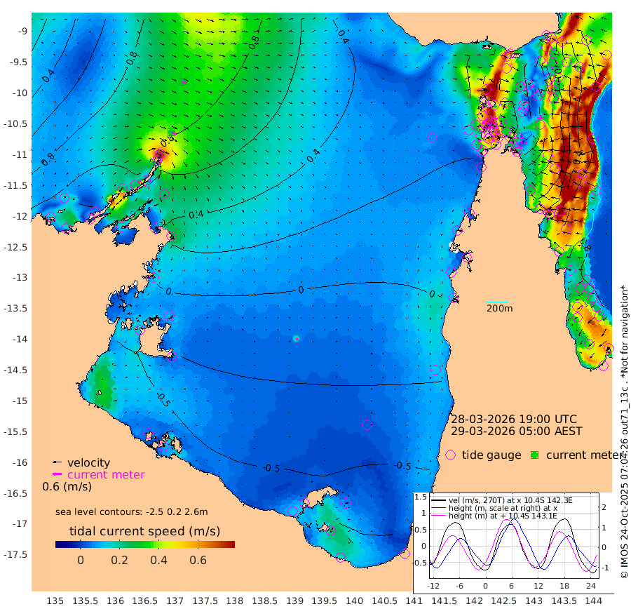 33cm/s 117T +3cm/s rms + 7cm/s -42T. ARA-GOC87 57m 16cm/s 153T +3cm/s rms + 2cm/s -2T. ARA-GOC87 60m 29cm/s 114T +2cm/s rms + 3cm/s 61T. ARA-GOC87 47m -41cm Daru -24cm Bobo Island 53cm Meer Island Barge 34cm Bramble Cay -4cm Unnamed Cay -3cm Pearce Cay 9cm Stephens Island 1cm Merrie England Shoals -35cm Mutacomal Reef 21cm Darnley Island Barge 52cm East Cay -7cm Yorke Island Barge -22cm Rennel Island -20cm Aureed Island -47cm Dungeness Reef -77cm Zagai Island -76cm Yam Island -76cm Dauan Island -66cm Saibai Island -96cm Phipi Reef -82cm Warrior Reef - West -58cm Mabuiag Island Barge -19cm Half Way Island -49cm Coconut Island -34cm Dugong Islet -65cm Poll Island -63cm Kirkcaldie Reef -94cm Suarji Island -58cm Sue Islet 28cm Hawkesbury Island -74cm Alert Patches -71cm Twin Island -1cm Badu Island -86cm St Pauls (Moa Island) -9cm Kubin (Moa Island) -57cm Ince Point -42cm Thursday Island -48cm Nardana Patches -20cm Turtle Head -5cm Round Island 26cm Goods Island 45cm Booby Island 33cm White Rocks Area 50cm Carpentaria -65cm Papou Point 47cm Bampfield Head 30cm Crab Island 36cm Red Wallis Island 5cm Packe Island -51cm Harrington Reef 27cm Herald Camp -40cm Sharp Point -16cm Red Island Point -49cm Possession Island -64cm Alpha Rock -62cm Frederick Point -39cm Wyborn Reef Light -47cm Tetley Island 35cm Triangle Reef -27cm Turtle Head Island 45cm Maclennan Cay 64cm Raine Island -2cm Mcsweeny Reef 10cm Collette Reef 42cm Shadwell Reef 15cm Hannibal Island 35cm Round Point 37cm Vrilya Point 37cm Cape Grenville 43cm Hicks Island 58cm Sir Charles Hardy Island 10cm Harvey Island 59cm Kay Reef 63cm Rocky Island 75cm Chapman Island 73cm Ham Reef 66cm Jubilee Reef 51cm Night Island 70cm Unnamed Reef No. 3 65cm Morris Island 64cm 1st 3 Mile Opening 65cm Creech Reef 60cm Fife Island 90cm Eden Reef 70cm Stanley Island 75cm Normanby River 123cm Yabooma Island 130cm Hutchison River 112cm Elcho Island 100cm North West Crocodile Island 105cm Cape Wessel 110cm Stevens Island 101cm Guluwuru Island 110cm Hopeful Bay 102cm Auster Point 111cm Two Island Bay 136cm Cadell Strait 180cm Mallison Island 82cm Melville Bay (Gove Harbour) 93cm Truant Island 52cm Cape Arnhem 10cm Cape Grey -13cm Hawk Island -51cm Milner Bay (Groote Eylandt) -63cm Cape Beatrice -106cm West Island -108cm Centre Island -119cm Mornington Island -113cm West Wellesley Islands -119cm Bountiful Island -157cm Albert River Mouth -164cm Sweers Island -159cm Karumba -72cm Nassau River Offshore -29cm Christmas Creek 16cm Archer River 28cm Boyd Point 34cm Weipa (Humbug Point) 20cm Pennefather River 37cm Cullen Point