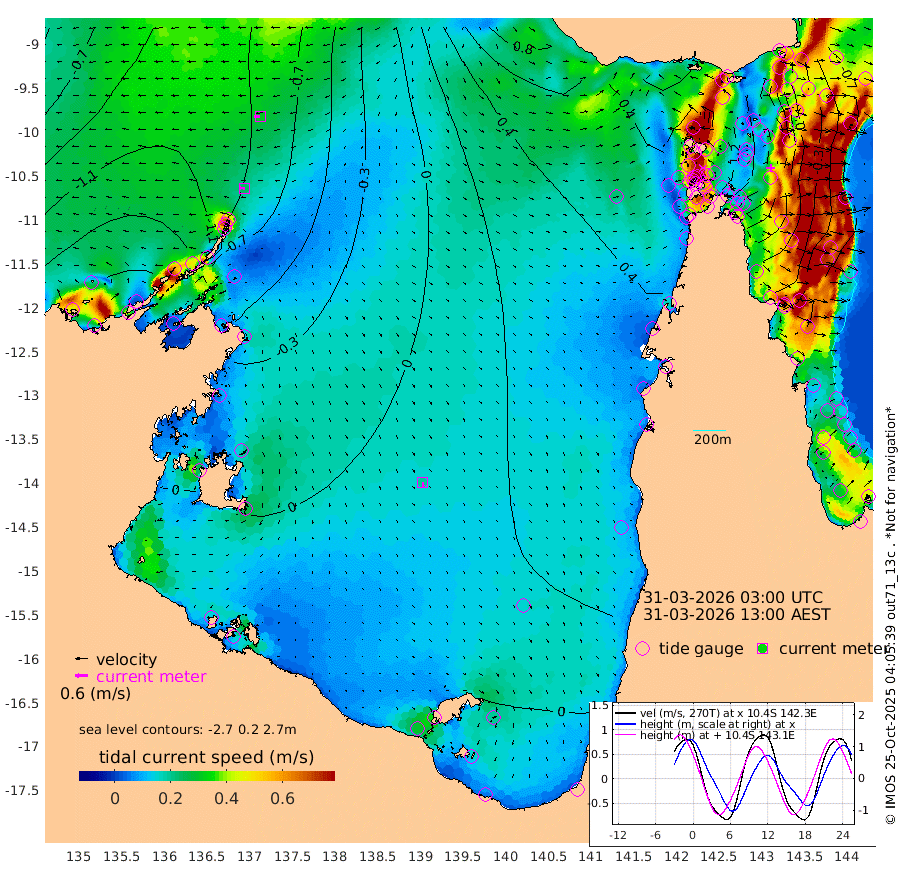 23cm/s -86T +3cm/s rms + 7cm/s -42T. ARA-GOC87 57m 20cm/s 173T +3cm/s rms + 2cm/s -2T. ARA-GOC87 60m 30cm/s -91T +2cm/s rms + 3cm/s 61T. ARA-GOC87 47m 31cm Daru 13cm Bobo Island -52cm Meer Island Barge -47cm Bramble Cay -13cm Unnamed Cay -4cm Pearce Cay -22cm Stephens Island -24cm Merrie England Shoals 19cm Mutacomal Reef -24cm Darnley Island Barge -59cm East Cay 6cm Yorke Island Barge 9cm Rennel Island 13cm Aureed Island 47cm Dungeness Reef 97cm Zagai Island 101cm Yam Island 143cm Dauan Island 133cm Saibai Island 132cm Phipi Reef 112cm Warrior Reef - West 115cm Mabuiag Island Barge 14cm Half Way Island 40cm Coconut Island 34cm Dugong Islet 73cm Poll Island 71cm Kirkcaldie Reef 100cm Suarji Island 77cm Sue Islet 76cm Hawkesbury Island 98cm Alert Patches 97cm Twin Island 85cm Badu Island 119cm St Pauls (Moa Island) 85cm Kubin (Moa Island) 102cm Ince Point 97cm Thursday Island 100cm Nardana Patches 83cm Turtle Head 67cm Round Island 59cm Goods Island 54cm Booby Island 45cm White Rocks Area 48cm Carpentaria 96cm Papou Point 31cm Bampfield Head 52cm Crab Island 60cm Red Wallis Island 73cm Packe Island 38cm Harrington Reef 67cm Herald Camp 48cm Sharp Point 77cm Red Island Point 80cm Possession Island 81cm Alpha Rock 73cm Frederick Point 27cm Wyborn Reef Light 42cm Tetley Island -28cm Triangle Reef 24cm Turtle Head Island -42cm Maclennan Cay -64cm Raine Island -10cm Mcsweeny Reef -22cm Collette Reef -44cm Shadwell Reef -32cm Hannibal Island -51cm Round Point 53cm Vrilya Point -48cm Cape Grenville -50cm Hicks Island -51cm Sir Charles Hardy Island -13cm Harvey Island -69cm Kay Reef -65cm Rocky Island -74cm Chapman Island -66cm Ham Reef -62cm Jubilee Reef -52cm Night Island -67cm Unnamed Reef No. 3 -69cm Morris Island -64cm 1st 3 Mile Opening -63cm Creech Reef -67cm Fife Island -91cm Eden Reef -74cm Stanley Island -83cm Normanby River -161cm Yabooma Island -174cm Hutchison River -156cm Elcho Island -141cm North West Crocodile Island -115cm Cape Wessel -150cm Stevens Island -97cm Guluwuru Island -148cm Hopeful Bay -126cm Auster Point -116cm Two Island Bay -139cm Cadell Strait -127cm Mallison Island -94cm Melville Bay (Gove Harbour) -99cm Truant Island -60cm Cape Arnhem -44cm Cape Grey -31cm Hawk Island -25cm Milner Bay (Groote Eylandt) -10cm Cape Beatrice 18cm West Island 16cm Centre Island 20cm Mornington Island 14cm West Wellesley Islands -2cm Bountiful Island -7cm Albert River Mouth -24cm Sweers Island 8cm Karumba 29cm Nassau River Offshore 34cm Christmas Creek 22cm Archer River 33cm Boyd Point 23cm Weipa (Humbug Point) 38cm Pennefather River 47cm Cullen Point