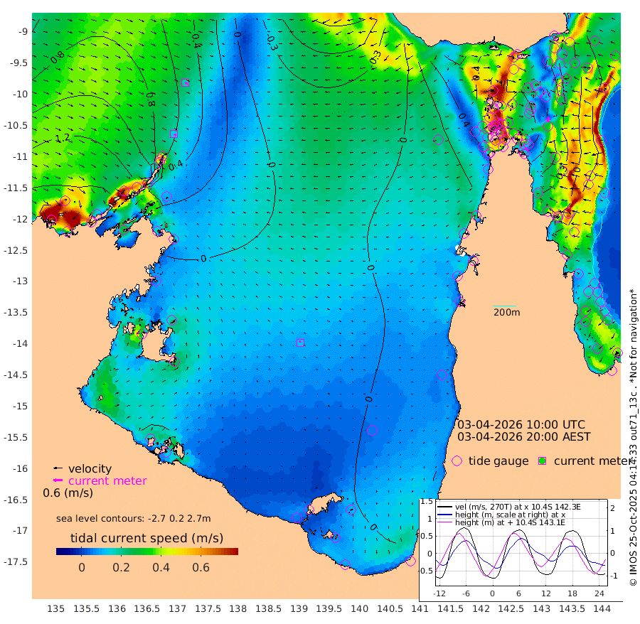15cm/s 135T +3cm/s rms + 7cm/s -42T. ARA-GOC87 57m 12cm/s -26T +3cm/s rms + 2cm/s -2T. ARA-GOC87 60m 18cm/s 122T +2cm/s rms + 3cm/s 61T. ARA-GOC87 47m -35cm Daru -30cm Bobo Island 16cm Meer Island Barge 15cm Bramble Cay -9cm Unnamed Cay -13cm Pearce Cay -5cm Stephens Island 4cm Merrie England Shoals -26cm Mutacomal Reef -10cm Darnley Island Barge 23cm East Cay -28cm Yorke Island Barge -18cm Rennel Island -37cm Aureed Island -41cm Dungeness Reef -79cm Zagai Island -72cm Yam Island -85cm Dauan Island -90cm Saibai Island -64cm Phipi Reef -84cm Warrior Reef - West -50cm Mabuiag Island Barge -23cm Half Way Island -38cm Coconut Island -39cm Dugong Islet -55cm Poll Island -45cm Kirkcaldie Reef -75cm Suarji Island -61cm Sue Islet 44cm Hawkesbury Island -45cm Alert Patches -54cm Twin Island 23cm Badu Island -69cm St Pauls (Moa Island) 2cm Kubin (Moa Island) -38cm Ince Point -24cm Thursday Island -29cm Nardana Patches 2cm Turtle Head 22cm Round Island 40cm Goods Island 53cm Booby Island 52cm White Rocks Area 16cm Carpentaria -49cm Papou Point 54cm Bampfield Head 57cm Crab Island 43cm Red Wallis Island 17cm Packe Island -39cm Harrington Reef 30cm Herald Camp -31cm Sharp Point 16cm Red Island Point -20cm Possession Island -56cm Alpha Rock -48cm Frederick Point -31cm Wyborn Reef Light -38cm Tetley Island 3cm Triangle Reef -16cm Turtle Head Island 10cm Maclennan Cay 36cm Raine Island -12cm Mcsweeny Reef -1cm Collette Reef 17cm Shadwell Reef 2cm Hannibal Island 22cm Round Point 53cm Vrilya Point 16cm Cape Grenville 19cm Hicks Island 7cm Sir Charles Hardy Island 3cm Harvey Island 31cm Kay Reef 29cm Rocky Island 35cm Chapman Island 30cm Ham Reef 28cm Jubilee Reef 22cm Night Island 32cm Unnamed Reef No. 3 33cm Morris Island 30cm 1st 3 Mile Opening 28cm Creech Reef 30cm Fife Island 42cm Eden Reef 36cm Stanley Island 39cm Normanby River 149cm Yabooma Island 157cm Hutchison River 141cm Elcho Island 138cm North West Crocodile Island 56cm Cape Wessel 121cm Stevens Island 23cm Guluwuru Island 117cm Hopeful Bay 86cm Auster Point 79cm Two Island Bay 110cm Cadell Strait -25cm Mallison Island 33cm Melville Bay (Gove Harbour) 33cm Truant Island 9cm Cape Arnhem 4cm Cape Grey 0cm Hawk Island -12cm Milner Bay (Groote Eylandt) -15cm Cape Beatrice -44cm West Island -39cm Centre Island -28cm Mornington Island -33cm West Wellesley Islands -26cm Bountiful Island -6cm Albert River Mouth -3cm Sweers Island 3cm Karumba -12cm Nassau River Offshore -3cm Christmas Creek 32cm Archer River 18cm Boyd Point 33cm Weipa (Humbug Point) 45cm Pennefather River 33cm Cullen Point