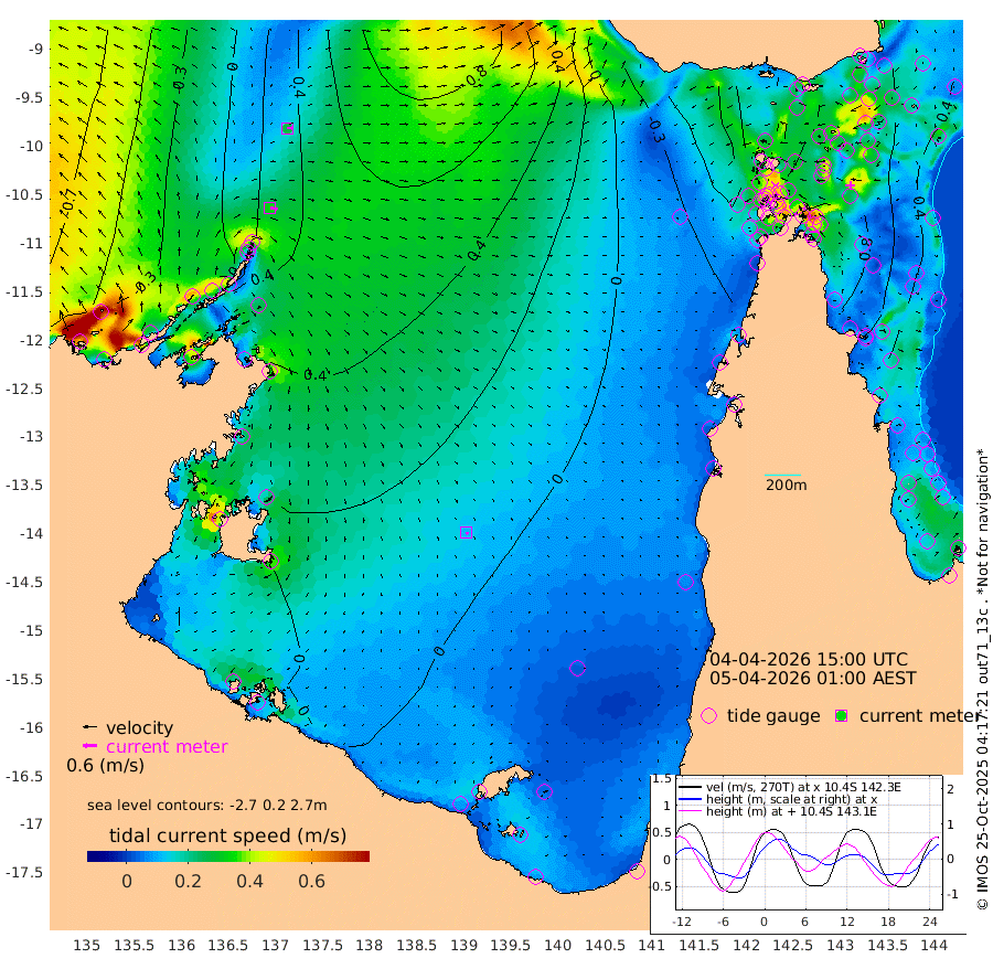 32cm/s 100T +3cm/s rms + 7cm/s -42T. ARA-GOC87 57m 11cm/s 140T +3cm/s rms + 2cm/s -2T. ARA-GOC87 60m 27cm/s 89T +2cm/s rms + 3cm/s 61T. ARA-GOC87 47m 85cm Daru 93cm Bobo Island 40cm Meer Island Barge 52cm Bramble Cay 65cm Unnamed Cay 82cm Pearce Cay 64cm Stephens Island 60cm Merrie England Shoals 74cm Mutacomal Reef 66cm Darnley Island Barge 42cm East Cay 77cm Yorke Island Barge 69cm Rennel Island 87cm Aureed Island 79cm Dungeness Reef 99cm Zagai Island 79cm Yam Island 80cm Dauan Island 87cm Saibai Island 88cm Phipi Reef 100cm Warrior Reef - West 51cm Mabuiag Island Barge 65cm Half Way Island 91cm Coconut Island 68cm Dugong Islet 80cm Poll Island 73cm Kirkcaldie Reef 85cm Suarji Island 82cm Sue Islet -15cm Hawkesbury Island 66cm Alert Patches 71cm Twin Island 16cm Badu Island 74cm St Pauls (Moa Island) 12cm Kubin (Moa Island) 48cm Ince Point 34cm Thursday Island 38cm Nardana Patches 17cm Turtle Head 3cm Round Island -13cm Goods Island -33cm Booby Island -31cm White Rocks Area -26cm Carpentaria 64cm Papou Point -17cm Bampfield Head -26cm Crab Island -29cm Red Wallis Island 0cm Packe Island 82cm Harrington Reef -23cm Herald Camp 23cm Sharp Point 20cm Red Island Point 45cm Possession Island 63cm Alpha Rock 79cm Frederick Point 83cm Wyborn Reef Light 85cm Tetley Island 47cm Triangle Reef 78cm Turtle Head Island 36cm Maclennan Cay 24cm Raine Island 66cm Mcsweeny Reef 61cm Collette Reef 40cm Shadwell Reef 64cm Hannibal Island 52cm Round Point -31cm Vrilya Point 41cm Cape Grenville 42cm Hicks Island 43cm Sir Charles Hardy Island 13cm Harvey Island 33cm Kay Reef 30cm Rocky Island 31cm Chapman Island 26cm Ham Reef 29cm Jubilee Reef 27cm Night Island 27cm Unnamed Reef No. 3 28cm Morris Island 23cm 1st 3 Mile Opening 28cm Creech Reef 31cm Fife Island 29cm Eden Reef 22cm Stanley Island 25cm Normanby River -35cm Yabooma Island -9cm Hutchison River -24cm Elcho Island -32cm North West Crocodile Island 32cm Cape Wessel 2cm Stevens Island 76cm Guluwuru Island -5cm Hopeful Bay 16cm Auster Point 8cm Two Island Bay 37cm Cadell Strait 176cm Mallison Island 57cm Melville Bay (Gove Harbour) 65cm Truant Island 52cm Cape Arnhem 30cm Cape Grey 18cm Hawk Island -10cm Milner Bay (Groote Eylandt) -20cm Cape Beatrice -42cm West Island -37cm Centre Island -20cm Mornington Island -28cm West Wellesley Islands -33cm Bountiful Island -56cm Albert River Mouth -48cm Sweers Island -51cm Karumba -16cm Nassau River Offshore -4cm Christmas Creek -8cm Archer River -7cm Boyd Point -17cm Weipa (Humbug Point) -14cm Pennefather River -27cm Cullen Point