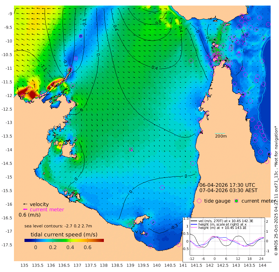 9cm/s 112T +3cm/s rms + 7cm/s -42T. ARA-GOC87 57m 24cm/s 153T +3cm/s rms + 2cm/s -2T. ARA-GOC87 60m 2cm/s 162T +2cm/s rms + 3cm/s 61T. ARA-GOC87 47m 30cm Daru 34cm Bobo Island 29cm Meer Island Barge 24cm Bramble Cay 26cm Unnamed Cay 30cm Pearce Cay 27cm Stephens Island 23cm Merrie England Shoals 27cm Mutacomal Reef 37cm Darnley Island Barge 27cm East Cay 39cm Yorke Island Barge 23cm Rennel Island 40cm Aureed Island 30cm Dungeness Reef 43cm Zagai Island 32cm Yam Island 46cm Dauan Island 61cm Saibai Island 40cm Phipi Reef 45cm Warrior Reef - West 35cm Mabuiag Island Barge 24cm Half Way Island 34cm Coconut Island 27cm Dugong Islet 30cm Poll Island 27cm Kirkcaldie Reef 36cm Suarji Island 43cm Sue Islet 15cm Hawkesbury Island 33cm Alert Patches 33cm Twin Island 19cm Badu Island 34cm St Pauls (Moa Island) 15cm Kubin (Moa Island) 28cm Ince Point 26cm Thursday Island 26cm Nardana Patches 21cm Turtle Head 15cm Round Island 14cm Goods Island 16cm Booby Island 5cm White Rocks Area 43cm Carpentaria 26cm Papou Point 28cm Bampfield Head 12cm Crab Island 16cm Red Wallis Island 19cm Packe Island 28cm Harrington Reef 23cm Herald Camp 13cm Sharp Point 20cm Red Island Point 26cm Possession Island 32cm Alpha Rock 32cm Frederick Point 30cm Wyborn Reef Light 31cm Tetley Island 33cm Triangle Reef 23cm Turtle Head Island 27cm Maclennan Cay 22cm Raine Island 30cm Mcsweeny Reef 32cm Collette Reef 30cm Shadwell Reef 32cm Hannibal Island 24cm Round Point 22cm Vrilya Point 27cm Cape Grenville 24cm Hicks Island 37cm Sir Charles Hardy Island 8cm Harvey Island 28cm Kay Reef 27cm Rocky Island 34cm Chapman Island 32cm Ham Reef 28cm Jubilee Reef 24cm Night Island 31cm Unnamed Reef No. 3 24cm Morris Island 23cm 1st 3 Mile Opening 28cm Creech Reef 24cm Fife Island 29cm Eden Reef 26cm Stanley Island 21cm Normanby River -137cm Yabooma Island -150cm Hutchison River -138cm Elcho Island -141cm North West Crocodile Island -45cm Cape Wessel -106cm Stevens Island -12cm Guluwuru Island -92cm Hopeful Bay -70cm Auster Point -75cm Two Island Bay -90cm Cadell Strait 133cm Mallison Island -24cm Melville Bay (Gove Harbour) -20cm Truant Island -5cm Cape Arnhem -15cm Cape Grey -18cm Hawk Island -32cm Milner Bay (Groote Eylandt) -35cm Cape Beatrice -30cm West Island -25cm Centre Island -27cm Mornington Island -26cm West Wellesley Islands -43cm Bountiful Island -97cm Albert River Mouth -89cm Sweers Island -85cm Karumba -5cm Nassau River Offshore 21cm Christmas Creek 27cm Archer River 34cm Boyd Point 25cm Weipa (Humbug Point) 23cm Pennefather River 28cm Cullen Point