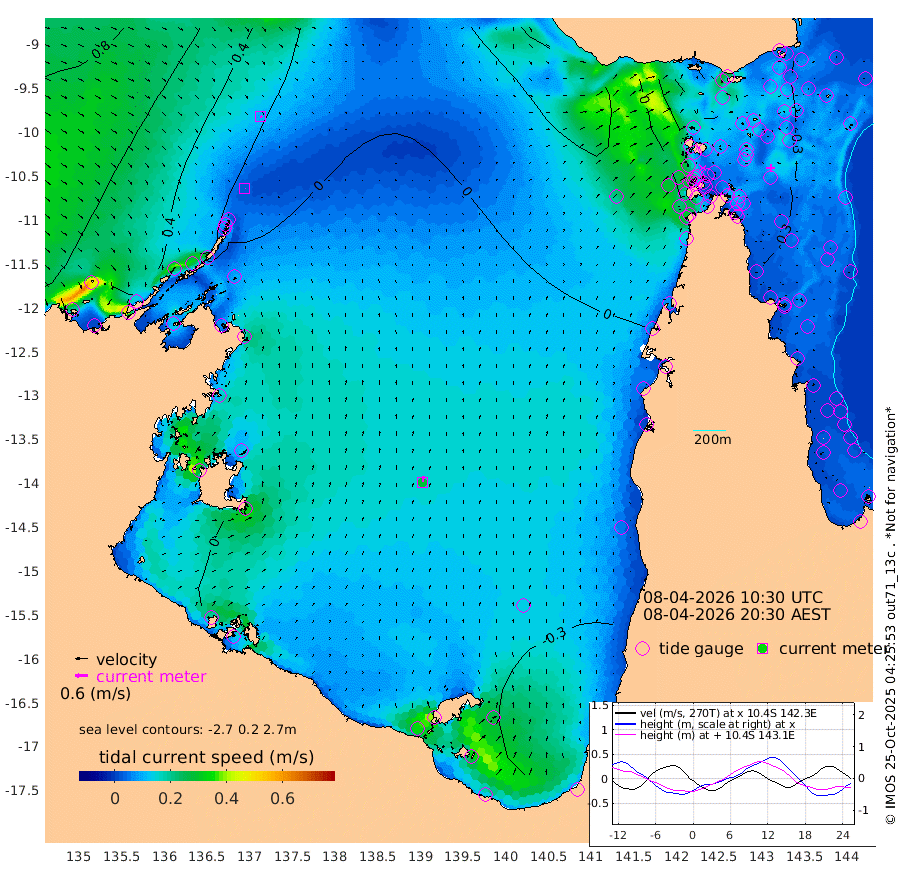 2cm/s 103T +3cm/s rms + 7cm/s -42T. ARA-GOC87 57m 29cm/s 6T +3cm/s rms + 2cm/s -2T. ARA-GOC87 60m 10cm/s 122T +2cm/s rms + 3cm/s 61T. ARA-GOC87 47m -33cm Daru -26cm Bobo Island -18cm Meer Island Barge -21cm Bramble Cay -26cm Unnamed Cay -22cm Pearce Cay -17cm Stephens Island -21cm Merrie England Shoals -30cm Mutacomal Reef -27cm Darnley Island Barge -14cm East Cay -32cm Yorke Island Barge -19cm Rennel Island -27cm Aureed Island -32cm Dungeness Reef -50cm Zagai Island -42cm Yam Island -86cm Dauan Island -88cm Saibai Island -86cm Phipi Reef -66cm Warrior Reef - West -45cm Mabuiag Island Barge -14cm Half Way Island -25cm Coconut Island -20cm Dugong Islet -29cm Poll Island -25cm Kirkcaldie Reef -33cm Suarji Island -42cm Sue Islet -9cm Hawkesbury Island -28cm Alert Patches -23cm Twin Island -24cm Badu Island -31cm St Pauls (Moa Island) -11cm Kubin (Moa Island) -22cm Ince Point -15cm Thursday Island -19cm Nardana Patches -17cm Turtle Head -4cm Round Island -3cm Goods Island 13cm Booby Island 21cm White Rocks Area 30cm Carpentaria -18cm Papou Point 21cm Bampfield Head 18cm Crab Island 15cm Red Wallis Island -4cm Packe Island -11cm Harrington Reef -1cm Herald Camp -14cm Sharp Point -10cm Red Island Point -11cm Possession Island -25cm Alpha Rock -22cm Frederick Point -26cm Wyborn Reef Light -27cm Tetley Island -24cm Triangle Reef -9cm Turtle Head Island -14cm Maclennan Cay -12cm Raine Island -22cm Mcsweeny Reef -26cm Collette Reef -25cm Shadwell Reef -26cm Hannibal Island -17cm Round Point 23cm Vrilya Point -15cm Cape Grenville -14cm Hicks Island -29cm Sir Charles Hardy Island -4cm Harvey Island -16cm Kay Reef -19cm Rocky Island -21cm Chapman Island -18cm Ham Reef -17cm Jubilee Reef -12cm Night Island -15cm Unnamed Reef No. 3 -14cm Morris Island -12cm 1st 3 Mile Opening -14cm Creech Reef -10cm Fife Island -18cm Eden Reef -13cm Stanley Island -8cm Normanby River 56cm Yabooma Island 48cm Hutchison River 52cm Elcho Island 52cm North West Crocodile Island 27cm Cape Wessel 40cm Stevens Island -20cm Guluwuru Island 31cm Hopeful Bay 35cm Auster Point 36cm Two Island Bay 15cm Cadell Strait -137cm Mallison Island -10cm Melville Bay (Gove Harbour) -5cm Truant Island -11cm Cape Arnhem -8cm Cape Grey -10cm Hawk Island 14cm Milner Bay (Groote Eylandt) 7cm Cape Beatrice 14cm West Island 18cm Centre Island -37cm Mornington Island -34cm West Wellesley Islands -63cm Bountiful Island -44cm Albert River Mouth -42cm Sweers Island -48cm Karumba -54cm Nassau River Offshore -56cm Christmas Creek -34cm Archer River -22cm Boyd Point -26cm Weipa (Humbug Point) 3cm Pennefather River 6cm Cullen Point