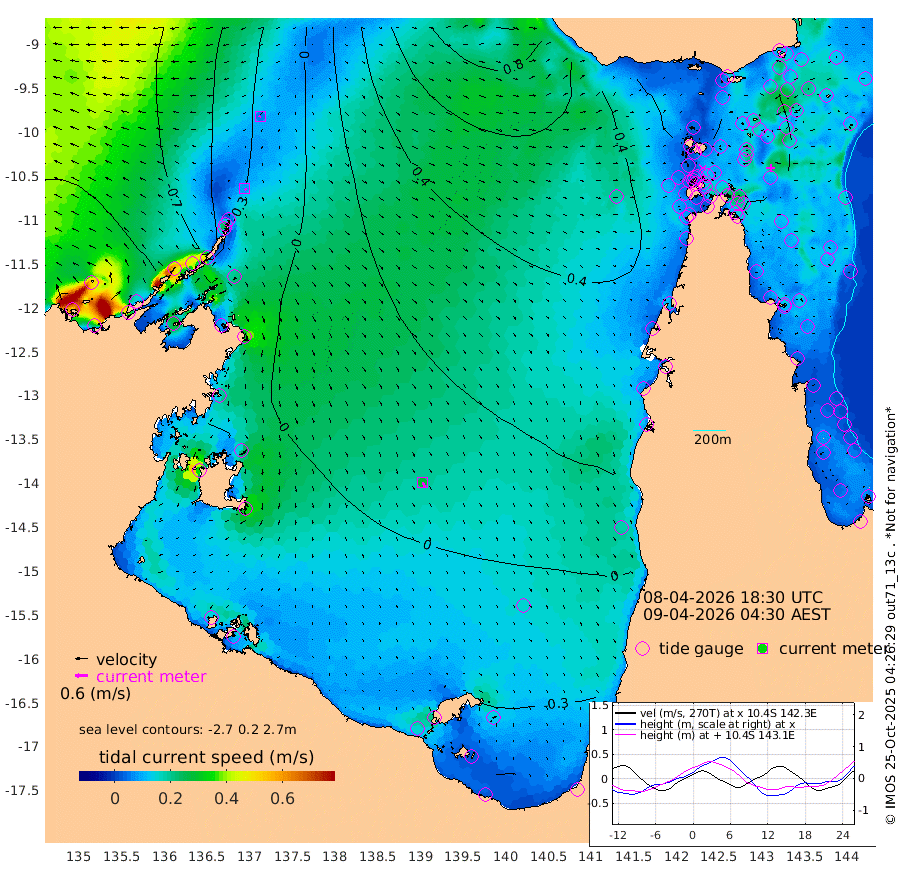 8cm/s 134T +3cm/s rms + 7cm/s -42T. ARA-GOC87 57m 28cm/s 158T +3cm/s rms + 2cm/s -2T. ARA-GOC87 60m 5cm/s -140T +2cm/s rms + 3cm/s 61T. ARA-GOC87 47m 36cm Daru 35cm Bobo Island 47cm Meer Island Barge 47cm Bramble Cay 46cm Unnamed Cay 37cm Pearce Cay 42cm Stephens Island 49cm Merrie England Shoals 43cm Mutacomal Reef 50cm Darnley Island Barge 48cm East Cay 45cm Yorke Island Barge 35cm Rennel Island 39cm Aureed Island 28cm Dungeness Reef 23cm Zagai Island 21cm Yam Island 25cm Dauan Island 37cm Saibai Island 16cm Phipi Reef 26cm Warrior Reef - West 24cm Mabuiag Island Barge 33cm Half Way Island 32cm Coconut Island 34cm Dugong Islet 24cm Poll Island 25cm Kirkcaldie Reef 17cm Suarji Island 36cm Sue Islet 40cm Hawkesbury Island 28cm Alert Patches 25cm Twin Island 28cm Badu Island 20cm St Pauls (Moa Island) 28cm Kubin (Moa Island) 25cm Ince Point 27cm Thursday Island 25cm Nardana Patches 30cm Turtle Head 33cm Round Island 35cm Goods Island 41cm Booby Island 31cm White Rocks Area 58cm Carpentaria 13cm Papou Point 57cm Bampfield Head 31cm Crab Island 41cm Red Wallis Island 40cm Packe Island 30cm Harrington Reef 51cm Herald Camp 5cm Sharp Point 22cm Red Island Point 24cm Possession Island 33cm Alpha Rock 29cm Frederick Point 41cm Wyborn Reef Light 39cm Tetley Island 47cm Triangle Reef 32cm Turtle Head Island 44cm Maclennan Cay 43cm Raine Island 44cm Mcsweeny Reef 50cm Collette Reef 51cm Shadwell Reef 53cm Hannibal Island 50cm Round Point 41cm Vrilya Point 52cm Cape Grenville 44cm Hicks Island 60cm Sir Charles Hardy Island 14cm Harvey Island 57cm Kay Reef 50cm Rocky Island 58cm Chapman Island 55cm Ham Reef 50cm Jubilee Reef 44cm Night Island 55cm Unnamed Reef No. 3 49cm Morris Island 45cm 1st 3 Mile Opening 50cm Creech Reef 49cm Fife Island 57cm Eden Reef 55cm Stanley Island 51cm Normanby River -99cm Yabooma Island -117cm Hutchison River -107cm Elcho Island -112cm North West Crocodile Island -31cm Cape Wessel -74cm Stevens Island -7cm Guluwuru Island -59cm Hopeful Bay -50cm Auster Point -53cm Two Island Bay -70cm Cadell Strait 174cm Mallison Island -17cm Melville Bay (Gove Harbour) -11cm Truant Island -5cm Cape Arnhem -23cm Cape Grey -23cm Hawk Island -45cm Milner Bay (Groote Eylandt) -48cm Cape Beatrice -50cm West Island -48cm Centre Island -48cm Mornington Island -44cm West Wellesley Islands -65cm Bountiful Island -123cm Albert River Mouth -120cm Sweers Island -110cm Karumba -11cm Nassau River Offshore 25cm Christmas Creek 40cm Archer River 47cm Boyd Point 43cm Weipa (Humbug Point) 37cm Pennefather River 48cm Cullen Point