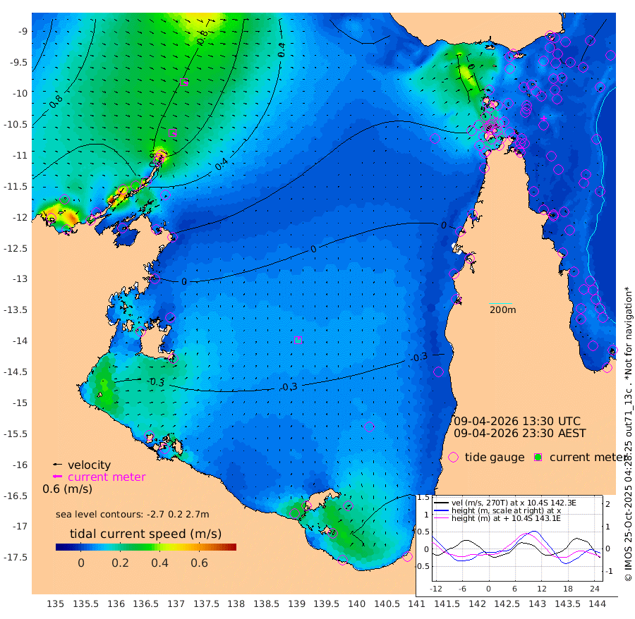 29cm/s 118T +3cm/s rms + 7cm/s -42T. ARA-GOC87 57m 17cm/s 14T +3cm/s rms + 2cm/s -2T. ARA-GOC87 60m 32cm/s 114T +2cm/s rms + 3cm/s 61T. ARA-GOC87 47m -8cm Daru -7cm Bobo Island -17cm Meer Island Barge -21cm Bramble Cay -17cm Unnamed Cay -10cm Pearce Cay -14cm Stephens Island -24cm Merrie England Shoals -17cm Mutacomal Reef -20cm Darnley Island Barge -22cm East Cay -14cm Yorke Island Barge -9cm Rennel Island -11cm Aureed Island 1cm Dungeness Reef 16cm Zagai Island 17cm Yam Island 21cm Dauan Island 7cm Saibai Island 14cm Phipi Reef 7cm Warrior Reef - West 28cm Mabuiag Island Barge -5cm Half Way Island 3cm Coconut Island -5cm Dugong Islet 11cm Poll Island 8cm Kirkcaldie Reef 19cm Suarji Island -1cm Sue Islet 54cm Hawkesbury Island 19cm Alert Patches 23cm Twin Island 57cm Badu Island 30cm St Pauls (Moa Island) 55cm Kubin (Moa Island) 32cm Ince Point 39cm Thursday Island 37cm Nardana Patches 42cm Turtle Head 58cm Round Island 56cm Goods Island 63cm Booby Island 62cm White Rocks Area 50cm Carpentaria 34cm Papou Point 78cm Bampfield Head 56cm Crab Island 56cm Red Wallis Island 48cm Packe Island 0cm Harrington Reef 57cm Herald Camp 1cm Sharp Point 33cm Red Island Point 39cm Possession Island 9cm Alpha Rock 12cm Frederick Point -3cm Wyborn Reef Light 1cm Tetley Island -15cm Triangle Reef 14cm Turtle Head Island -15cm Maclennan Cay -15cm Raine Island -16cm Mcsweeny Reef -23cm Collette Reef -22cm Shadwell Reef -25cm Hannibal Island -22cm Round Point 45cm Vrilya Point -26cm Cape Grenville -16cm Hicks Island -24cm Sir Charles Hardy Island -6cm Harvey Island -31cm Kay Reef -24cm Rocky Island -29cm Chapman Island -26cm Ham Reef -21cm Jubilee Reef -19cm Night Island -27cm Unnamed Reef No. 3 -22cm Morris Island -12cm 1st 3 Mile Opening -21cm Creech Reef -27cm Fife Island -27cm Eden Reef -27cm Stanley Island -28cm Normanby River 134cm Yabooma Island 154cm Hutchison River 132cm Elcho Island 125cm North West Crocodile Island 84cm Cape Wessel 114cm Stevens Island 66cm Guluwuru Island 93cm Hopeful Bay 97cm Auster Point 105cm Two Island Bay 120cm Cadell Strait -50cm Mallison Island 62cm Melville Bay (Gove Harbour) 71cm Truant Island 40cm Cape Arnhem 16cm Cape Grey -1cm Hawk Island -10cm Milner Bay (Groote Eylandt) -27cm Cape Beatrice -57cm West Island -53cm Centre Island -88cm Mornington Island -95cm West Wellesley Islands -104cm Bountiful Island -92cm Albert River Mouth -103cm Sweers Island -98cm Karumba -83cm Nassau River Offshore -61cm Christmas Creek -25cm Archer River -3cm Boyd Point -2cm Weipa (Humbug Point) 15cm Pennefather River 31cm Cullen Point