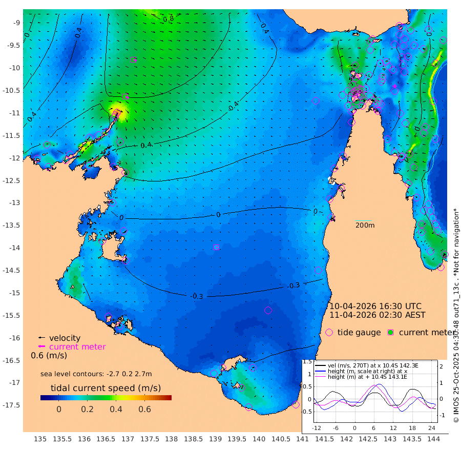 35cm/s 115T +3cm/s rms + 7cm/s -42T. ARA-GOC87 57m 10cm/s 130T +3cm/s rms + 2cm/s -2T. ARA-GOC87 60m 31cm/s 111T +2cm/s rms + 3cm/s 61T. ARA-GOC87 47m -17cm Daru -20cm Bobo Island 10cm Meer Island Barge -4cm Bramble Cay -11cm Unnamed Cay -19cm Pearce Cay -11cm Stephens Island -17cm Merrie England Shoals -23cm Mutacomal Reef -1cm Darnley Island Barge -1cm East Cay -7cm Yorke Island Barge -20cm Rennel Island -19cm Aureed Island -15cm Dungeness Reef -2cm Zagai Island -4cm Yam Island 24cm Dauan Island 19cm Saibai Island 2cm Phipi Reef -6cm Warrior Reef - West 15cm Mabuiag Island Barge -15cm Half Way Island -20cm Coconut Island -17cm Dugong Islet -15cm Poll Island -16cm Kirkcaldie Reef -21cm Suarji Island -9cm Sue Islet 45cm Hawkesbury Island -11cm Alert Patches -10cm Twin Island 44cm Badu Island -5cm St Pauls (Moa Island) 35cm Kubin (Moa Island) 4cm Ince Point 13cm Thursday Island 12cm Nardana Patches 24cm Turtle Head 36cm Round Island 45cm Goods Island 56cm Booby Island 41cm White Rocks Area 55cm Carpentaria -2cm Papou Point 66cm Bampfield Head 45cm Crab Island 45cm Red Wallis Island 33cm Packe Island -30cm Harrington Reef 52cm Herald Camp -8cm Sharp Point 9cm Red Island Point 4cm Possession Island -11cm Alpha Rock -18cm Frederick Point -17cm Wyborn Reef Light -16cm Tetley Island 4cm Triangle Reef -9cm Turtle Head Island 5cm Maclennan Cay 13cm Raine Island -13cm Mcsweeny Reef -10cm Collette Reef 7cm Shadwell Reef -10cm Hannibal Island -9cm Round Point 45cm Vrilya Point -6cm Cape Grenville 1cm Hicks Island 11cm Sir Charles Hardy Island -1cm Harvey Island 0cm Kay Reef 7cm Rocky Island 8cm Chapman Island 11cm Ham Reef 12cm Jubilee Reef 5cm Night Island 6cm Unnamed Reef No. 3 7cm Morris Island 19cm 1st 3 Mile Opening 10cm Creech Reef -2cm Fife Island 15cm Eden Reef 9cm Stanley Island 1cm Normanby River 80cm Yabooma Island 90cm Hutchison River 73cm Elcho Island 62cm North West Crocodile Island 70cm Cape Wessel 77cm Stevens Island 89cm Guluwuru Island 65cm Hopeful Bay 71cm Auster Point 81cm Two Island Bay 99cm Cadell Strait 143cm Mallison Island 69cm Melville Bay (Gove Harbour) 79cm Truant Island 49cm Cape Arnhem 13cm Cape Grey -9cm Hawk Island -34cm Milner Bay (Groote Eylandt) -50cm Cape Beatrice -86cm West Island -85cm Centre Island -101cm Mornington Island -101cm West Wellesley Islands -112cm Bountiful Island -125cm Albert River Mouth -142cm Sweers Island -135cm Karumba -72cm Nassau River Offshore -34cm Christmas Creek 1cm Archer River 21cm Boyd Point 23cm Weipa (Humbug Point) 24cm Pennefather River 41cm Cullen Point