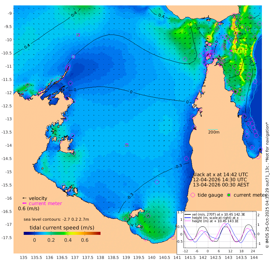 14cm/s 116T +3cm/s rms + 7cm/s -42T. ARA-GOC87 57m 21cm/s 18T +3cm/s rms + 2cm/s -2T. ARA-GOC87 60m 20cm/s 116T +2cm/s rms + 3cm/s 61T. ARA-GOC87 47m -58cm Daru -51cm Bobo Island -63cm Meer Island Barge -78cm Bramble Cay -77cm Unnamed Cay -60cm Pearce Cay -71cm Stephens Island -89cm Merrie England Shoals -70cm Mutacomal Reef -68cm Darnley Island Barge -70cm East Cay -58cm Yorke Island Barge -62cm Rennel Island -47cm Aureed Island -39cm Dungeness Reef 6cm Zagai Island 1cm Yam Island 27cm Dauan Island 31cm Saibai Island 9cm Phipi Reef -3cm Warrior Reef - West 36cm Mabuiag Island Barge -58cm Half Way Island -35cm Coconut Island -51cm Dugong Islet -18cm Poll Island -28cm Kirkcaldie Reef 12cm Suarji Island -19cm Sue Islet 26cm Hawkesbury Island 0cm Alert Patches 5cm Twin Island 41cm Badu Island 18cm St Pauls (Moa Island) 28cm Kubin (Moa Island) 18cm Ince Point 25cm Thursday Island 24cm Nardana Patches 21cm Turtle Head 28cm Round Island 31cm Goods Island 44cm Booby Island 42cm White Rocks Area 59cm Carpentaria 22cm Papou Point 49cm Bampfield Head 37cm Crab Island 39cm Red Wallis Island 20cm Packe Island -46cm Harrington Reef 28cm Herald Camp 4cm Sharp Point 24cm Red Island Point 17cm Possession Island -9cm Alpha Rock -18cm Frederick Point -54cm Wyborn Reef Light -44cm Tetley Island -49cm Triangle Reef -49cm Turtle Head Island -56cm Maclennan Cay -55cm Raine Island -68cm Mcsweeny Reef -73cm Collette Reef -66cm Shadwell Reef -82cm Hannibal Island -83cm Round Point 32cm Vrilya Point -78cm Cape Grenville -67cm Hicks Island -67cm Sir Charles Hardy Island -22cm Harvey Island -80cm Kay Reef -66cm Rocky Island -64cm Chapman Island -60cm Ham Reef -62cm Jubilee Reef -60cm Night Island -62cm Unnamed Reef No. 3 -69cm Morris Island -56cm 1st 3 Mile Opening -63cm Creech Reef -73cm Fife Island -79cm Eden Reef -76cm Stanley Island -81cm Normanby River 36cm Yabooma Island 43cm Hutchison River 39cm Elcho Island 38cm North West Crocodile Island 36cm Cape Wessel 25cm Stevens Island 14cm Guluwuru Island 15cm Hopeful Bay 32cm Auster Point 32cm Two Island Bay 26cm Cadell Strait -104cm Mallison Island 11cm Melville Bay (Gove Harbour) 19cm Truant Island 10cm Cape Arnhem 5cm Cape Grey -10cm Hawk Island 3cm Milner Bay (Groote Eylandt) -12cm Cape Beatrice -14cm West Island -9cm Centre Island -61cm Mornington Island -63cm West Wellesley Islands -68cm Bountiful Island -68cm Albert River Mouth -73cm Sweers Island -77cm Karumba -70cm Nassau River Offshore -58cm Christmas Creek -31cm Archer River -7cm Boyd Point -11cm Weipa (Humbug Point) -1cm Pennefather River 23cm Cullen Point