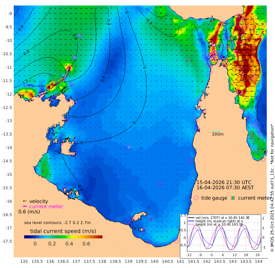 13cm/s 117T +3cm/s rms + 7cm/s -42T. ARA-GOC87 57m 13cm/s -178T +3cm/s rms + 2cm/s -2T. ARA-GOC87 60m 12cm/s 111T +2cm/s rms + 3cm/s 61T. ARA-GOC87 47m 59cm Daru 65cm Bobo Island 93cm Meer Island Barge 103cm Bramble Cay 90cm Unnamed Cay 84cm Pearce Cay 95cm Stephens Island 97cm Merrie England Shoals 68cm Mutacomal Reef 89cm Darnley Island Barge 103cm East Cay 70cm Yorke Island Barge 74cm Rennel Island 59cm Aureed Island 45cm Dungeness Reef -17cm Zagai Island -2cm Yam Island -52cm Dauan Island -57cm Saibai Island -47cm Phipi Reef -16cm Warrior Reef - West -41cm Mabuiag Island Barge 76cm Half Way Island 37cm Coconut Island 66cm Dugong Islet 18cm Poll Island 32cm Kirkcaldie Reef -22cm Suarji Island 11cm Sue Islet 16cm Hawkesbury Island -11cm Alert Patches -7cm Twin Island -9cm Badu Island -23cm St Pauls (Moa Island) 4cm Kubin (Moa Island) -15cm Ince Point -14cm Thursday Island -16cm Nardana Patches -3cm Turtle Head -7cm Round Island 13cm Goods Island 6cm Booby Island 14cm White Rocks Area -20cm Carpentaria -11cm Papou Point -3cm Bampfield Head -6cm Crab Island 3cm Red Wallis Island 6cm Packe Island 58cm Harrington Reef 4cm Herald Camp -21cm Sharp Point 0cm Red Island Point -15cm Possession Island -1cm Alpha Rock 19cm Frederick Point 56cm Wyborn Reef Light 43cm Tetley Island 67cm Triangle Reef 73cm Turtle Head Island 88cm Maclennan Cay 87cm Raine Island 81cm Mcsweeny Reef 80cm Collette Reef 81cm Shadwell Reef 94cm Hannibal Island 106cm Round Point -11cm Vrilya Point 98cm Cape Grenville 98cm Hicks Island 103cm Sir Charles Hardy Island 30cm Harvey Island 105cm Kay Reef 96cm Rocky Island 91cm Chapman Island 89cm Ham Reef 94cm Jubilee Reef 81cm Night Island 90cm Unnamed Reef No. 3 102cm Morris Island 92cm 1st 3 Mile Opening 95cm Creech Reef 99cm Fife Island 120cm Eden Reef 106cm Stanley Island 123cm Normanby River 156cm Yabooma Island 170cm Hutchison River 139cm Elcho Island 136cm North West Crocodile Island 95cm Cape Wessel 129cm Stevens Island 94cm Guluwuru Island 116cm Hopeful Bay 104cm Auster Point 114cm Two Island Bay 153cm Cadell Strait 85cm Mallison Island 82cm Melville Bay (Gove Harbour) 84cm Truant Island 45cm Cape Arnhem 27cm Cape Grey 4cm Hawk Island -23cm Milner Bay (Groote Eylandt) -21cm Cape Beatrice -52cm West Island -67cm Centre Island -45cm Mornington Island -38cm West Wellesley Islands -18cm Bountiful Island -41cm Albert River Mouth -54cm Sweers Island -44cm Karumba -12cm Nassau River Offshore 0cm Christmas Creek 5cm Archer River 2cm Boyd Point 12cm Weipa (Humbug Point) -11cm Pennefather River -11cm Cullen Point