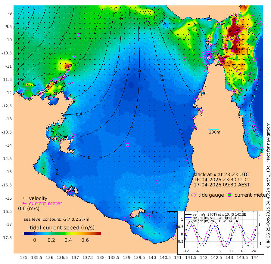 16cm/s 92T +3cm/s rms + 7cm/s -42T. ARA-GOC87 57m 12cm/s -171T +3cm/s rms + 2cm/s -2T. ARA-GOC87 60m 15cm/s 74T +2cm/s rms + 3cm/s 61T. ARA-GOC87 47m 129cm Daru 131cm Bobo Island 90cm Meer Island Barge 122cm Bramble Cay 135cm Unnamed Cay 134cm Pearce Cay 131cm Stephens Island 139cm Merrie England Shoals 136cm Mutacomal Reef 117cm Darnley Island Barge 102cm East Cay 119cm Yorke Island Barge 127cm Rennel Island 115cm Aureed Island 110cm Dungeness Reef 68cm Zagai Island 77cm Yam Island 15cm Dauan Island 11cm Saibai Island 28cm Phipi Reef 72cm Warrior Reef - West 4cm Mabuiag Island Barge 127cm Half Way Island 108cm Coconut Island 125cm Dugong Islet 93cm Poll Island 101cm Kirkcaldie Reef 57cm Suarji Island 83cm Sue Islet -13cm Hawkesbury Island 49cm Alert Patches 60cm Twin Island -17cm Badu Island 51cm St Pauls (Moa Island) 7cm Kubin (Moa Island) 29cm Ince Point 13cm Thursday Island 16cm Nardana Patches 0cm Turtle Head -17cm Round Island -24cm Goods Island -56cm Booby Island -38cm White Rocks Area -82cm Carpentaria 49cm Papou Point -64cm Bampfield Head -58cm Crab Island -48cm Red Wallis Island -8cm Packe Island 129cm Harrington Reef -38cm Herald Camp 9cm Sharp Point 4cm Red Island Point 19cm Possession Island 65cm Alpha Rock 90cm Frederick Point 127cm Wyborn Reef Light 119cm Tetley Island 76cm Triangle Reef 135cm Turtle Head Island 87cm Maclennan Cay 65cm Raine Island 122cm Mcsweeny Reef 111cm Collette Reef 82cm Shadwell Reef 127cm Hannibal Island 124cm Round Point -67cm Vrilya Point 107cm Cape Grenville 102cm Hicks Island 100cm Sir Charles Hardy Island 33cm Harvey Island 98cm Kay Reef 81cm Rocky Island 68cm Chapman Island 66cm Ham Reef 77cm Jubilee Reef 71cm Night Island 68cm Unnamed Reef No. 3 85cm Morris Island 69cm 1st 3 Mile Opening 75cm Creech Reef 86cm Fife Island 93cm Eden Reef 85cm Stanley Island 105cm Normanby River 129cm Yabooma Island 160cm Hutchison River 125cm Elcho Island 124cm North West Crocodile Island 97cm Cape Wessel 127cm Stevens Island 116cm Guluwuru Island 104cm Hopeful Bay 98cm Auster Point 110cm Two Island Bay 159cm Cadell Strait 126cm Mallison Island 100cm Melville Bay (Gove Harbour) 101cm Truant Island 62cm Cape Arnhem 44cm Cape Grey 27cm Hawk Island -5cm Milner Bay (Groote Eylandt) -2cm Cape Beatrice -32cm West Island -48cm Centre Island -14cm Mornington Island -13cm West Wellesley Islands 7cm Bountiful Island -1cm Albert River Mouth -12cm Sweers Island -4cm Karumba -1cm Nassau River Offshore -7cm Christmas Creek -27cm Archer River -34cm Boyd Point -34cm Weipa (Humbug Point) -48cm Pennefather River -63cm Cullen Point