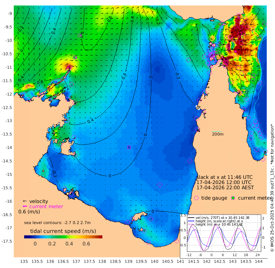 34cm/s 101T +3cm/s rms + 7cm/s -42T. ARA-GOC87 57m 2cm/s -38T +3cm/s rms + 2cm/s -2T. ARA-GOC87 60m 32cm/s 87T +2cm/s rms + 3cm/s 61T. ARA-GOC87 47m 146cm Daru 151cm Bobo Island 105cm Meer Island Barge 134cm Bramble Cay 149cm Unnamed Cay 150cm Pearce Cay 147cm Stephens Island 153cm Merrie England Shoals 144cm Mutacomal Reef 134cm Darnley Island Barge 115cm East Cay 134cm Yorke Island Barge 142cm Rennel Island 135cm Aureed Island 128cm Dungeness Reef 87cm Zagai Island 80cm Yam Island 19cm Dauan Island 7cm Saibai Island 58cm Phipi Reef 82cm Warrior Reef - West 3cm Mabuiag Island Barge 138cm Half Way Island 136cm Coconut Island 130cm Dugong Islet 106cm Poll Island 113cm Kirkcaldie Reef 82cm Suarji Island 91cm Sue Islet -21cm Hawkesbury Island 72cm Alert Patches 76cm Twin Island -8cm Badu Island 65cm St Pauls (Moa Island) 10cm Kubin (Moa Island) 40cm Ince Point 24cm Thursday Island 27cm Nardana Patches 14cm Turtle Head 11cm Round Island -15cm Goods Island -44cm Booby Island -32cm White Rocks Area -66cm Carpentaria 60cm Papou Point -11cm Bampfield Head -34cm Crab Island -44cm Red Wallis Island -1cm Packe Island 147cm Harrington Reef -23cm Herald Camp 11cm Sharp Point 8cm Red Island Point 55cm Possession Island 71cm Alpha Rock 106cm Frederick Point 145cm Wyborn Reef Light 135cm Tetley Island 89cm Triangle Reef 160cm Turtle Head Island 96cm Maclennan Cay 83cm Raine Island 138cm Mcsweeny Reef 131cm Collette Reef 100cm Shadwell Reef 147cm Hannibal Island 139cm Round Point -46cm Vrilya Point 120cm Cape Grenville 118cm Hicks Island 103cm Sir Charles Hardy Island 38cm Harvey Island 108cm Kay Reef 92cm Rocky Island 81cm Chapman Island 75cm Ham Reef 88cm Jubilee Reef 87cm Night Island 79cm Unnamed Reef No. 3 99cm Morris Island 90cm 1st 3 Mile Opening 91cm Creech Reef 99cm Fife Island 107cm Eden Reef 98cm Stanley Island 110cm Normanby River 84cm Yabooma Island 126cm Hutchison River 91cm Elcho Island 78cm North West Crocodile Island 76cm Cape Wessel 102cm Stevens Island 114cm Guluwuru Island 85cm Hopeful Bay 88cm Auster Point 83cm Two Island Bay 127cm Cadell Strait 149cm Mallison Island 100cm Melville Bay (Gove Harbour) 106cm Truant Island 73cm Cape Arnhem 49cm Cape Grey 39cm Hawk Island 3cm Milner Bay (Groote Eylandt) -5cm Cape Beatrice -44cm West Island -40cm Centre Island -6cm Mornington Island -16cm West Wellesley Islands -18cm Bountiful Island -14cm Albert River Mouth -7cm Sweers Island -9cm Karumba -10cm Nassau River Offshore -6cm Christmas Creek -14cm Archer River -23cm Boyd Point -25cm Weipa (Humbug Point) -17cm Pennefather River -48cm Cullen Point