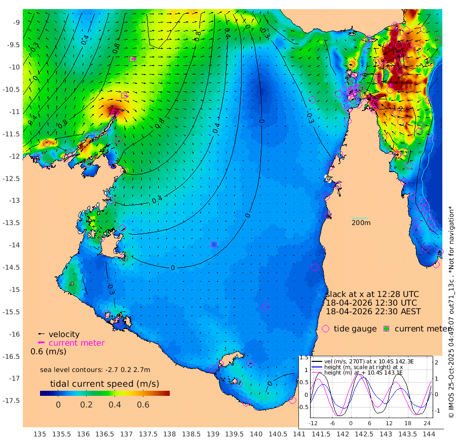 41cm/s 107T +3cm/s rms + 7cm/s -42T. ARA-GOC87 57m 4cm/s 179T +3cm/s rms + 2cm/s -2T. ARA-GOC87 60m 38cm/s 95T +2cm/s rms + 3cm/s 61T. ARA-GOC87 47m 142cm Daru 148cm Bobo Island 107cm Meer Island Barge 131cm Bramble Cay 142cm Unnamed Cay 150cm Pearce Cay 144cm Stephens Island 144cm Merrie England Shoals 136cm Mutacomal Reef 132cm Darnley Island Barge 115cm East Cay 131cm Yorke Island Barge 138cm Rennel Island 134cm Aureed Island 127cm Dungeness Reef 90cm Zagai Island 83cm Yam Island 34cm Dauan Island 18cm Saibai Island 65cm Phipi Reef 87cm Warrior Reef - West 13cm Mabuiag Island Barge 135cm Half Way Island 133cm Coconut Island 128cm Dugong Islet 106cm Poll Island 111cm Kirkcaldie Reef 83cm Suarji Island 90cm Sue Islet 0cm Hawkesbury Island 74cm Alert Patches 79cm Twin Island 14cm Badu Island 70cm St Pauls (Moa Island) 29cm Kubin (Moa Island) 49cm Ince Point 35cm Thursday Island 38cm Nardana Patches 30cm Turtle Head 24cm Round Island 9cm Goods Island -18cm Booby Island -9cm White Rocks Area -44cm Carpentaria 66cm Papou Point 9cm Bampfield Head -12cm Crab Island -18cm Red Wallis Island 20cm Packe Island 142cm Harrington Reef -3cm Herald Camp 10cm Sharp Point 21cm Red Island Point 59cm Possession Island 69cm Alpha Rock 105cm Frederick Point 138cm Wyborn Reef Light 129cm Tetley Island 92cm Triangle Reef 156cm Turtle Head Island 99cm Maclennan Cay 87cm Raine Island 133cm Mcsweeny Reef 126cm Collette Reef 99cm Shadwell Reef 141cm Hannibal Island 135cm Round Point -26cm Vrilya Point 116cm Cape Grenville 117cm Hicks Island 106cm Sir Charles Hardy Island 37cm Harvey Island 105cm Kay Reef 93cm Rocky Island 84cm Chapman Island 78cm Ham Reef 90cm Jubilee Reef 89cm Night Island 82cm Unnamed Reef No. 3 101cm Morris Island 94cm 1st 3 Mile Opening 93cm Creech Reef 100cm Fife Island 111cm Eden Reef 98cm Stanley Island 110cm Normanby River 105cm Yabooma Island 152cm Hutchison River 112cm Elcho Island 97cm North West Crocodile Island 93cm Cape Wessel 118cm Stevens Island 132cm Guluwuru Island 97cm Hopeful Bay 103cm Auster Point 101cm Two Island Bay 154cm Cadell Strait 158cm Mallison Island 114cm Melville Bay (Gove Harbour) 122cm Truant Island 82cm Cape Arnhem 47cm Cape Grey 32cm Hawk Island -13cm Milner Bay (Groote Eylandt) -22cm Cape Beatrice -71cm West Island -68cm Centre Island -32cm Mornington Island -42cm West Wellesley Islands -47cm Bountiful Island -45cm Albert River Mouth -49cm Sweers Island -42cm Karumba -22cm Nassau River Offshore -7cm Christmas Creek -6cm Archer River -10cm Boyd Point -10cm Weipa (Humbug Point) -5cm Pennefather River -29cm Cullen Point