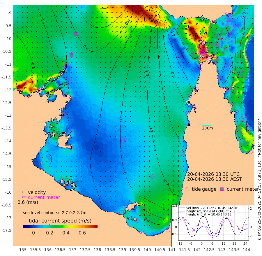 23cm/s 43T +3cm/s rms + 7cm/s -42T. ARA-GOC87 57m 8cm/s -8T +3cm/s rms + 2cm/s -2T. ARA-GOC87 60m 28cm/s 35T +2cm/s rms + 3cm/s 61T. ARA-GOC87 47m 33cm Daru 35cm Bobo Island -11cm Meer Island Barge 0cm Bramble Cay 18cm Unnamed Cay 18cm Pearce Cay 12cm Stephens Island 13cm Merrie England Shoals 28cm Mutacomal Reef 16cm Darnley Island Barge -17cm East Cay 29cm Yorke Island Barge 15cm Rennel Island 27cm Aureed Island 20cm Dungeness Reef 40cm Zagai Island 27cm Yam Island 9cm Dauan Island 23cm Saibai Island 4cm Phipi Reef 37cm Warrior Reef - West -24cm Mabuiag Island Barge 20cm Half Way Island 20cm Coconut Island 25cm Dugong Islet 22cm Poll Island 17cm Kirkcaldie Reef 5cm Suarji Island 33cm Sue Islet -142cm Hawkesbury Island -19cm Alert Patches -7cm Twin Island -123cm Badu Island 2cm St Pauls (Moa Island) -98cm Kubin (Moa Island) -40cm Ince Point -65cm Thursday Island -57cm Nardana Patches -102cm Turtle Head -119cm Round Island -155cm Goods Island -185cm Booby Island -176cm White Rocks Area -151cm Carpentaria -4cm Papou Point -193cm Bampfield Head -159cm Crab Island -172cm Red Wallis Island -132cm Packe Island 23cm Harrington Reef -158cm Herald Camp 15cm Sharp Point -90cm Red Island Point -51cm Possession Island 11cm Alpha Rock 8cm Frederick Point 28cm Wyborn Reef Light 28cm Tetley Island -11cm Triangle Reef 17cm Turtle Head Island -18cm Maclennan Cay -38cm Raine Island 13cm Mcsweeny Reef 8cm Collette Reef -14cm Shadwell Reef 11cm Hannibal Island -9cm Round Point -150cm Vrilya Point -12cm Cape Grenville -15cm Hicks Island -18cm Sir Charles Hardy Island -2cm Harvey Island -23cm Kay Reef -28cm Rocky Island -39cm Chapman Island -33cm Ham Reef -27cm Jubilee Reef -26cm Night Island -37cm Unnamed Reef No. 3 -31cm Morris Island -38cm 1st 3 Mile Opening -32cm Creech Reef -28cm Fife Island -34cm Eden Reef -32cm Stanley Island -26cm Normanby River -27cm Yabooma Island -13cm Hutchison River -14cm Elcho Island -12cm North West Crocodile Island 30cm Cape Wessel 11cm Stevens Island 72cm Guluwuru Island 0cm Hopeful Bay 14cm Auster Point 28cm Two Island Bay 41cm Cadell Strait 162cm Mallison Island 52cm Melville Bay (Gove Harbour) 53cm Truant Island 46cm Cape Arnhem 48cm Cape Grey 47cm Hawk Island 50cm Milner Bay (Groote Eylandt) 46cm Cape Beatrice 51cm West Island 45cm Centre Island 47cm Mornington Island 48cm West Wellesley Islands 48cm Bountiful Island 74cm Albert River Mouth 88cm Sweers Island 59cm Karumba -3cm Nassau River Offshore -44cm Christmas Creek -90cm Archer River -95cm Boyd Point -116cm Weipa (Humbug Point) -104cm Pennefather River -135cm Cullen Point