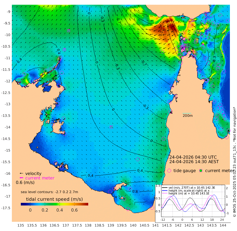 14cm/s 27T +3cm/s rms + 7cm/s -42T. ARA-GOC87 57m 18cm/s -61T +3cm/s rms + 2cm/s -2T. ARA-GOC87 60m 22cm/s 32T +2cm/s rms + 3cm/s 61T. ARA-GOC87 47m -72cm Daru -61cm Bobo Island -21cm Meer Island Barge -37cm Bramble Cay -64cm Unnamed Cay -56cm Pearce Cay -54cm Stephens Island -65cm Merrie England Shoals -82cm Mutacomal Reef -41cm Darnley Island Barge -29cm East Cay -54cm Yorke Island Barge -71cm Rennel Island -54cm Aureed Island -74cm Dungeness Reef -72cm Zagai Island -92cm Yam Island -60cm Dauan Island -62cm Saibai Island -57cm Phipi Reef -68cm Warrior Reef - West -102cm Mabuiag Island Barge -74cm Half Way Island -83cm Coconut Island -82cm Dugong Islet -89cm Poll Island -101cm Kirkcaldie Reef -98cm Suarji Island -87cm Sue Islet -163cm Hawkesbury Island -120cm Alert Patches -118cm Twin Island -139cm Badu Island -117cm St Pauls (Moa Island) -139cm Kubin (Moa Island) -124cm Ince Point -133cm Thursday Island -129cm Nardana Patches -131cm Turtle Head -142cm Round Island -144cm Goods Island -160cm Booby Island -159cm White Rocks Area -156cm Carpentaria -111cm Papou Point -176cm Bampfield Head -138cm Crab Island -158cm Red Wallis Island -146cm Packe Island -97cm Harrington Reef -159cm Herald Camp -30cm Sharp Point -129cm Red Island Point -122cm Possession Island -106cm Alpha Rock -108cm Frederick Point -88cm Wyborn Reef Light -94cm Tetley Island -30cm Triangle Reef -101cm Turtle Head Island -33cm Maclennan Cay -16cm Raine Island -58cm Mcsweeny Reef -48cm Collette Reef -26cm Shadwell Reef -48cm Hannibal Island -44cm Round Point -139cm Vrilya Point -42cm Cape Grenville -34cm Hicks Island -33cm Sir Charles Hardy Island -13cm Harvey Island -33cm Kay Reef -18cm Rocky Island -13cm Chapman Island -16cm Ham Reef -19cm Jubilee Reef -18cm Night Island -19cm Unnamed Reef No. 3 -20cm Morris Island -19cm 1st 3 Mile Opening -20cm Creech Reef -15cm Fife Island -7cm Eden Reef -22cm Stanley Island -21cm Normanby River 48cm Yabooma Island 71cm Hutchison River 67cm Elcho Island 60cm North West Crocodile Island 39cm Cape Wessel 56cm Stevens Island 63cm Guluwuru Island 60cm Hopeful Bay 43cm Auster Point 44cm Two Island Bay 79cm Cadell Strait 99cm Mallison Island 59cm Melville Bay (Gove Harbour) 53cm Truant Island 47cm Cape Arnhem 47cm Cape Grey 58cm Hawk Island 60cm Milner Bay (Groote Eylandt) 62cm Cape Beatrice 54cm West Island 54cm Centre Island 106cm Mornington Island 105cm West Wellesley Islands 138cm Bountiful Island 199cm Albert River Mouth 212cm Sweers Island 177cm Karumba 63cm Nassau River Offshore 12cm Christmas Creek -37cm Archer River -64cm Boyd Point -59cm Weipa (Humbug Point) -85cm Pennefather River -114cm Cullen Point