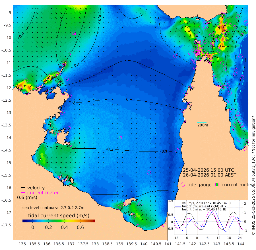 22cm/s 123T +3cm/s rms + 7cm/s -42T. ARA-GOC87 57m 15cm/s 20T +3cm/s rms + 2cm/s -2T. ARA-GOC87 60m 26cm/s 118T +2cm/s rms + 3cm/s 61T. ARA-GOC87 47m -85cm Daru -84cm Bobo Island -61cm Meer Island Barge -80cm Bramble Cay -88cm Unnamed Cay -88cm Pearce Cay -91cm Stephens Island -98cm Merrie England Shoals -88cm Mutacomal Reef -83cm Darnley Island Barge -70cm East Cay -80cm Yorke Island Barge -86cm Rennel Island -82cm Aureed Island -71cm Dungeness Reef -25cm Zagai Island -27cm Yam Island 25cm Dauan Island 30cm Saibai Island -1cm Phipi Reef -31cm Warrior Reef - West 40cm Mabuiag Island Barge -88cm Half Way Island -68cm Coconut Island -85cm Dugong Islet -51cm Poll Island -63cm Kirkcaldie Reef -26cm Suarji Island -45cm Sue Islet 81cm Hawkesbury Island -20cm Alert Patches -22cm Twin Island 77cm Badu Island -12cm St Pauls (Moa Island) 51cm Kubin (Moa Island) 7cm Ince Point 23cm Thursday Island 20cm Nardana Patches 36cm Turtle Head 68cm Round Island 71cm Goods Island 91cm Booby Island 81cm White Rocks Area 85cm Carpentaria -2cm Papou Point 113cm Bampfield Head 73cm Crab Island 79cm Red Wallis Island 49cm Packe Island -90cm Harrington Reef 84cm Herald Camp -9cm Sharp Point 33cm Red Island Point 15cm Possession Island -27cm Alpha Rock -49cm Frederick Point -72cm Wyborn Reef Light -64cm Tetley Island -48cm Triangle Reef -76cm Turtle Head Island -59cm Maclennan Cay -44cm Raine Island -86cm Mcsweeny Reef -81cm Collette Reef -59cm Shadwell Reef -91cm Hannibal Island -83cm Round Point 63cm Vrilya Point -78cm Cape Grenville -68cm Hicks Island -60cm Sir Charles Hardy Island -25cm Harvey Island -70cm Kay Reef -55cm Rocky Island -46cm Chapman Island -45cm Ham Reef -52cm Jubilee Reef -56cm Night Island -50cm Unnamed Reef No. 3 -60cm Morris Island -47cm 1st 3 Mile Opening -56cm Creech Reef -71cm Fife Island -64cm Eden Reef -64cm Stanley Island -73cm Normanby River 122cm Yabooma Island 129cm Hutchison River 116cm Elcho Island 110cm North West Crocodile Island 81cm Cape Wessel 101cm Stevens Island 50cm Guluwuru Island 94cm Hopeful Bay 88cm Auster Point 88cm Two Island Bay 91cm Cadell Strait -8cm Mallison Island 48cm Melville Bay (Gove Harbour) 57cm Truant Island 29cm Cape Arnhem 6cm Cape Grey -8cm Hawk Island -20cm Milner Bay (Groote Eylandt) -41cm Cape Beatrice -70cm West Island -63cm Centre Island -107cm Mornington Island -110cm West Wellesley Islands -106cm Bountiful Island -113cm Albert River Mouth -118cm Sweers Island -118cm Karumba -95cm Nassau River Offshore -63cm Christmas Creek -10cm Archer River 15cm Boyd Point 20cm Weipa (Humbug Point) 20cm Pennefather River 59cm Cullen Point