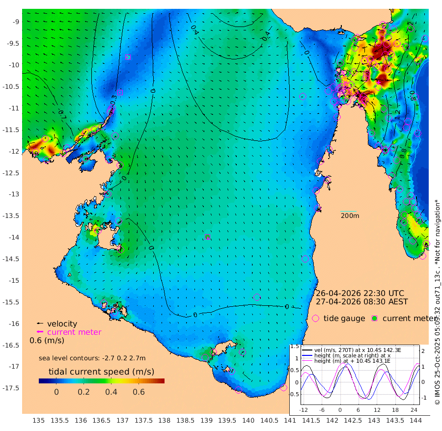 7cm/s -108T +3cm/s rms + 7cm/s -42T. ARA-GOC87 57m 30cm/s 168T +3cm/s rms + 2cm/s -2T. ARA-GOC87 60m 16cm/s -98T +2cm/s rms + 3cm/s 61T. ARA-GOC87 47m 150cm Daru 146cm Bobo Island 87cm Meer Island Barge 118cm Bramble Cay 142cm Unnamed Cay 147cm Pearce Cay 140cm Stephens Island 147cm Merrie England Shoals 156cm Mutacomal Reef 125cm Darnley Island Barge 101cm East Cay 134cm Yorke Island Barge 146cm Rennel Island 138cm Aureed Island 139cm Dungeness Reef 102cm Zagai Island 117cm Yam Island 57cm Dauan Island 52cm Saibai Island 70cm Phipi Reef 112cm Warrior Reef - West 53cm Mabuiag Island Barge 150cm Half Way Island 139cm Coconut Island 155cm Dugong Islet 131cm Poll Island 143cm Kirkcaldie Reef 109cm Suarji Island 122cm Sue Islet 56cm Hawkesbury Island 110cm Alert Patches 118cm Twin Island 38cm Badu Island 111cm St Pauls (Moa Island) 69cm Kubin (Moa Island) 91cm Ince Point 80cm Thursday Island 81cm Nardana Patches 64cm Turtle Head 47cm Round Island 40cm Goods Island 21cm Booby Island 30cm White Rocks Area 11cm Carpentaria 98cm Papou Point 15cm Bampfield Head 15cm Crab Island 34cm Red Wallis Island 68cm Packe Island 166cm Harrington Reef 46cm Herald Camp 31cm Sharp Point 65cm Red Island Point 80cm Possession Island 113cm Alpha Rock 138cm Frederick Point 149cm Wyborn Reef Light 146cm Tetley Island 84cm Triangle Reef 160cm Turtle Head Island 92cm Maclennan Cay 60cm Raine Island 135cm Mcsweeny Reef 121cm Collette Reef 83cm Shadwell Reef 132cm Hannibal Island 124cm Round Point 16cm Vrilya Point 113cm Cape Grenville 103cm Hicks Island 101cm Sir Charles Hardy Island 36cm Harvey Island 97cm Kay Reef 76cm Rocky Island 65cm Chapman Island 65cm Ham Reef 72cm Jubilee Reef 74cm Night Island 70cm Unnamed Reef No. 3 80cm Morris Island 64cm 1st 3 Mile Opening 75cm Creech Reef 86cm Fife Island 80cm Eden Reef 82cm Stanley Island 97cm Normanby River -59cm Yabooma Island -62cm Hutchison River -68cm Elcho Island -60cm North West Crocodile Island -27cm Cape Wessel -50cm Stevens Island -12cm Guluwuru Island -54cm Hopeful Bay -40cm Auster Point -28cm Two Island Bay -29cm Cadell Strait 23cm Mallison Island -17cm Melville Bay (Gove Harbour) -17cm Truant Island -14cm Cape Arnhem -20cm Cape Grey -21cm Hawk Island -42cm Milner Bay (Groote Eylandt) -29cm Cape Beatrice -24cm West Island -34cm Centre Island -16cm Mornington Island -17cm West Wellesley Islands -30cm Bountiful Island -77cm Albert River Mouth -88cm Sweers Island -56cm Karumba 20cm Nassau River Offshore 35cm Christmas Creek 21cm Archer River 23cm Boyd Point 16cm Weipa (Humbug Point) 16cm Pennefather River 15cm Cullen Point