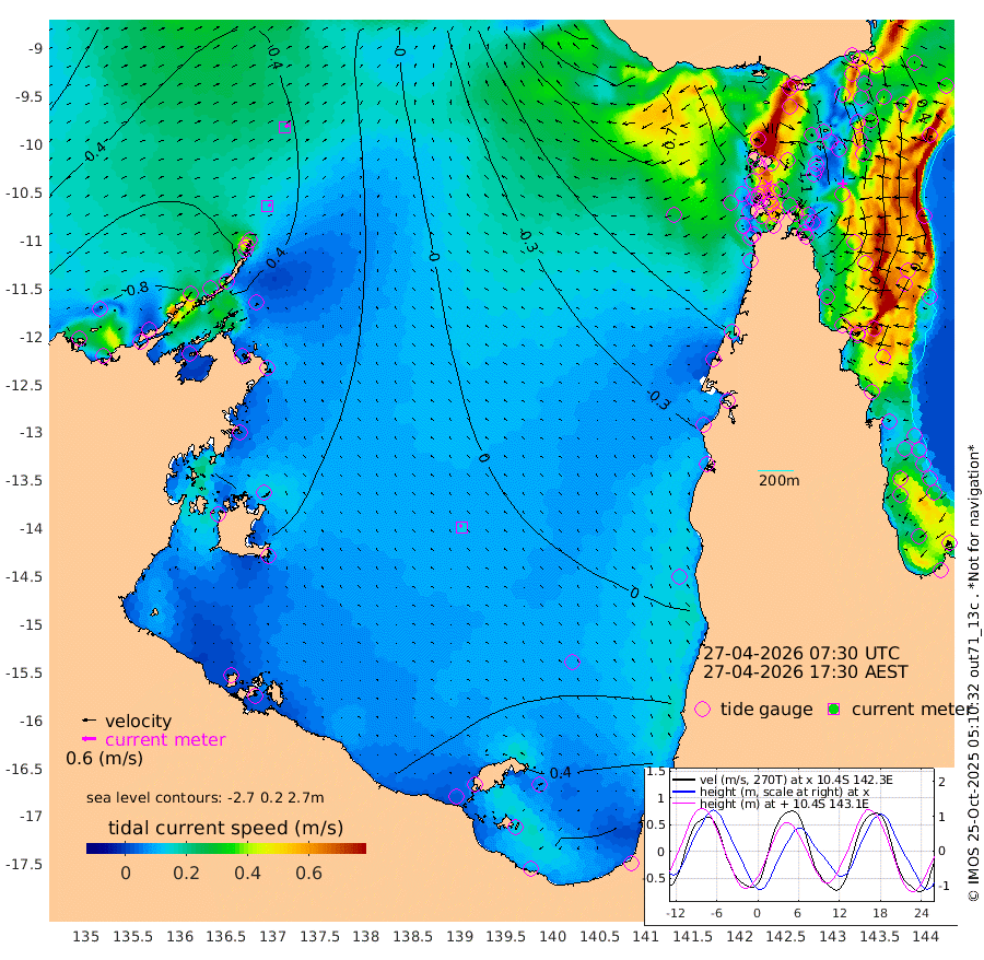 14cm/s 69T +3cm/s rms + 7cm/s -42T. ARA-GOC87 57m 14cm/s -44T +3cm/s rms + 2cm/s -2T. ARA-GOC87 60m 19cm/s 63T +2cm/s rms + 3cm/s 61T. ARA-GOC87 47m -51cm Daru -34cm Bobo Island 29cm Meer Island Barge 18cm Bramble Cay -20cm Unnamed Cay -18cm Pearce Cay -5cm Stephens Island -8cm Merrie England Shoals -50cm Mutacomal Reef 1cm Darnley Island Barge 32cm East Cay -27cm Yorke Island Barge -34cm Rennel Island -32cm Aureed Island -65cm Dungeness Reef -106cm Zagai Island -119cm Yam Island -132cm Dauan Island -128cm Saibai Island -119cm Phipi Reef -111cm Warrior Reef - West -132cm Mabuiag Island Barge -39cm Half Way Island -63cm Coconut Island -59cm Dugong Islet -92cm Poll Island -91cm Kirkcaldie Reef -121cm Suarji Island -93cm Sue Islet -128cm Hawkesbury Island -120cm Alert Patches -121cm Twin Island -121cm Badu Island -139cm St Pauls (Moa Island) -128cm Kubin (Moa Island) -127cm Ince Point -128cm Thursday Island -128cm Nardana Patches -114cm Turtle Head -123cm Round Island -105cm Goods Island -106cm Booby Island -104cm White Rocks Area -100cm Carpentaria -121cm Papou Point -116cm Bampfield Head -84cm Crab Island -108cm Red Wallis Island -117cm Packe Island -66cm Harrington Reef -132cm Herald Camp -45cm Sharp Point -103cm Red Island Point -117cm Possession Island -109cm Alpha Rock -98cm Frederick Point -61cm Wyborn Reef Light -75cm Tetley Island 6cm Triangle Reef -60cm Turtle Head Island 16cm Maclennan Cay 43cm Raine Island -15cm Mcsweeny Reef -1cm Collette Reef 23cm Shadwell Reef 4cm Hannibal Island 19cm Round Point -78cm Vrilya Point 17cm Cape Grenville 21cm Hicks Island 17cm Sir Charles Hardy Island 4cm Harvey Island 36cm Kay Reef 39cm Rocky Island 48cm Chapman Island 42cm Ham Reef 39cm Jubilee Reef 33cm Night Island 44cm Unnamed Reef No. 3 43cm Morris Island 39cm 1st 3 Mile Opening 40cm Creech Reef 51cm Fife Island 63cm Eden Reef 46cm Stanley Island 51cm Normanby River 65cm Yabooma Island 81cm Hutchison River 76cm Elcho Island 66cm North West Crocodile Island 48cm Cape Wessel 70cm Stevens Island 57cm Guluwuru Island 74cm Hopeful Bay 55cm Auster Point 46cm Two Island Bay 81cm Cadell Strait 115cm Mallison Island 53cm Melville Bay (Gove Harbour) 51cm Truant Island 38cm Cape Arnhem 36cm Cape Grey 35cm Hawk Island 34cm Milner Bay (Groote Eylandt) 35cm Cape Beatrice 20cm West Island 21cm Centre Island 57cm Mornington Island 61cm West Wellesley Islands 68cm Bountiful Island 110cm Albert River Mouth 123cm Sweers Island 96cm Karumba 35cm Nassau River Offshore 7cm Christmas Creek -8cm Archer River -35cm Boyd Point -29cm Weipa (Humbug Point) -36cm Pennefather River -74cm Cullen Point