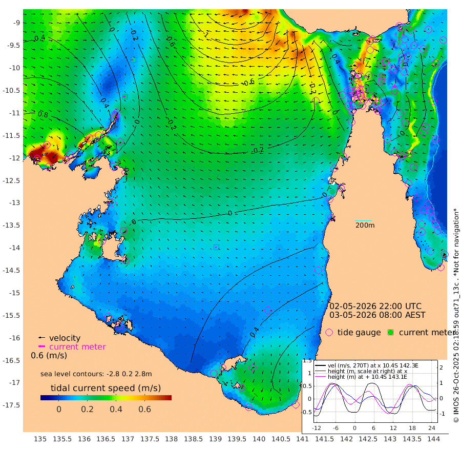 21cm/s -89T +3cm/s rms + 7cm/s -42T. ARA-GOC87 57m 12cm/s -116T +3cm/s rms + 2cm/s -2T. ARA-GOC87 60m 18cm/s -98T +2cm/s rms + 3cm/s 61T. ARA-GOC87 47m 2cm Daru -6cm Bobo Island 16cm Meer Island Barge 23cm Bramble Cay 16cm Unnamed Cay 2cm Pearce Cay 11cm Stephens Island 20cm Merrie England Shoals 9cm Mutacomal Reef 5cm Darnley Island Barge 23cm East Cay -3cm Yorke Island Barge 7cm Rennel Island -9cm Aureed Island -1cm Dungeness Reef -25cm Zagai Island -11cm Yam Island -12cm Dauan Island -23cm Saibai Island 2cm Phipi Reef -16cm Warrior Reef - West -10cm Mabuiag Island Barge 3cm Half Way Island -10cm Coconut Island 0cm Dugong Islet -12cm Poll Island -4cm Kirkcaldie Reef -16cm Suarji Island -18cm Sue Islet 26cm Hawkesbury Island -11cm Alert Patches -16cm Twin Island 22cm Badu Island -20cm St Pauls (Moa Island) 13cm Kubin (Moa Island) -7cm Ince Point -2cm Thursday Island -3cm Nardana Patches 15cm Turtle Head 14cm Round Island 30cm Goods Island 25cm Booby Island 31cm White Rocks Area -19cm Carpentaria -17cm Papou Point 10cm Bampfield Head 15cm Crab Island 20cm Red Wallis Island 21cm Packe Island -8cm Harrington Reef 23cm Herald Camp -11cm Sharp Point 12cm Red Island Point -10cm Possession Island -15cm Alpha Rock -13cm Frederick Point -3cm Wyborn Reef Light -8cm Tetley Island 9cm Triangle Reef -7cm Turtle Head Island 18cm Maclennan Cay 25cm Raine Island 8cm Mcsweeny Reef 11cm Collette Reef 18cm Shadwell Reef 15cm Hannibal Island 23cm Round Point 0cm Vrilya Point 22cm Cape Grenville 22cm Hicks Island 25cm Sir Charles Hardy Island 5cm Harvey Island 29cm Kay Reef 28cm Rocky Island 25cm Chapman Island 22cm Ham Reef 24cm Jubilee Reef 19cm Night Island 23cm Unnamed Reef No. 3 29cm Morris Island 26cm 1st 3 Mile Opening 23cm Creech Reef 24cm Fife Island 32cm Eden Reef 29cm Stanley Island 33cm Normanby River 94cm Yabooma Island 100cm Hutchison River 87cm Elcho Island 91cm North West Crocodile Island 9cm Cape Wessel 59cm Stevens Island -5cm Guluwuru Island 58cm Hopeful Bay 27cm Auster Point 26cm Two Island Bay 46cm Cadell Strait -76cm Mallison Island 7cm Melville Bay (Gove Harbour) -4cm Truant Island -8cm Cape Arnhem 5cm Cape Grey 5cm Hawk Island 9cm Milner Bay (Groote Eylandt) 19cm Cape Beatrice 18cm West Island 8cm Centre Island 51cm Mornington Island 52cm West Wellesley Islands 103cm Bountiful Island 115cm Albert River Mouth 101cm Sweers Island 111cm Karumba 66cm Nassau River Offshore 51cm Christmas Creek 33cm Archer River 15cm Boyd Point 36cm Weipa (Humbug Point) 0cm Pennefather River 6cm Cullen Point