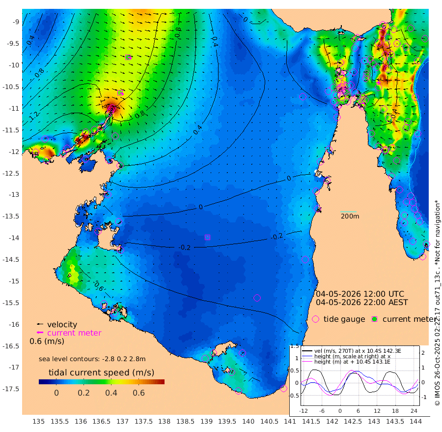 37cm/s 118T +3cm/s rms + 7cm/s -42T. ARA-GOC87 57m 5cm/s 26T +3cm/s rms + 2cm/s -2T. ARA-GOC87 60m 37cm/s 111T +2cm/s rms + 3cm/s 61T. ARA-GOC87 47m 52cm Daru 55cm Bobo Island 48cm Meer Island Barge 61cm Bramble Cay 62cm Unnamed Cay 57cm Pearce Cay 57cm Stephens Island 65cm Merrie England Shoals 56cm Mutacomal Reef 49cm Darnley Island Barge 53cm East Cay 46cm Yorke Island Barge 55cm Rennel Island 41cm Aureed Island 44cm Dungeness Reef 27cm Zagai Island 28cm Yam Island 8cm Dauan Island 1cm Saibai Island 22cm Phipi Reef 19cm Warrior Reef - West 24cm Mabuiag Island Barge 49cm Half Way Island 53cm Coconut Island 42cm Dugong Islet 38cm Poll Island 41cm Kirkcaldie Reef 25cm Suarji Island 29cm Sue Islet 81cm Hawkesbury Island 40cm Alert Patches 38cm Twin Island 71cm Badu Island 30cm St Pauls (Moa Island) 64cm Kubin (Moa Island) 39cm Ince Point 43cm Thursday Island 42cm Nardana Patches 54cm Turtle Head 79cm Round Island 72cm Goods Island 71cm Booby Island 71cm White Rocks Area 40cm Carpentaria 38cm Papou Point 105cm Bampfield Head 63cm Crab Island 62cm Red Wallis Island 63cm Packe Island 50cm Harrington Reef 73cm Herald Camp -4cm Sharp Point 50cm Red Island Point 56cm Possession Island 33cm Alpha Rock 44cm Frederick Point 64cm Wyborn Reef Light 60cm Tetley Island 43cm Triangle Reef 77cm Turtle Head Island 43cm Maclennan Cay 48cm Raine Island 52cm Mcsweeny Reef 53cm Collette Reef 48cm Shadwell Reef 60cm Hannibal Island 66cm Round Point 49cm Vrilya Point 53cm Cape Grenville 55cm Hicks Island 48cm Sir Charles Hardy Island 16cm Harvey Island 54cm Kay Reef 47cm Rocky Island 46cm Chapman Island 42cm Ham Reef 46cm Jubilee Reef 41cm Night Island 43cm Unnamed Reef No. 3 51cm Morris Island 50cm 1st 3 Mile Opening 45cm Creech Reef 42cm Fife Island 57cm Eden Reef 50cm Stanley Island 53cm Normanby River 176cm Yabooma Island 212cm Hutchison River 176cm Elcho Island 163cm North West Crocodile Island 116cm Cape Wessel 167cm Stevens Island 112cm Guluwuru Island 148cm Hopeful Bay 136cm Auster Point 135cm Two Island Bay 172cm Cadell Strait 92cm Mallison Island 102cm Melville Bay (Gove Harbour) 112cm Truant Island 64cm Cape Arnhem 27cm Cape Grey 11cm Hawk Island -33cm Milner Bay (Groote Eylandt) -49cm Cape Beatrice -106cm West Island -100cm Centre Island -104cm Mornington Island -115cm West Wellesley Islands -121cm Bountiful Island -122cm Albert River Mouth -128cm Sweers Island -116cm Karumba -82cm Nassau River Offshore -46cm Christmas Creek 3cm Archer River 13cm Boyd Point 19cm Weipa (Humbug Point) 32cm Pennefather River 35cm Cullen Point