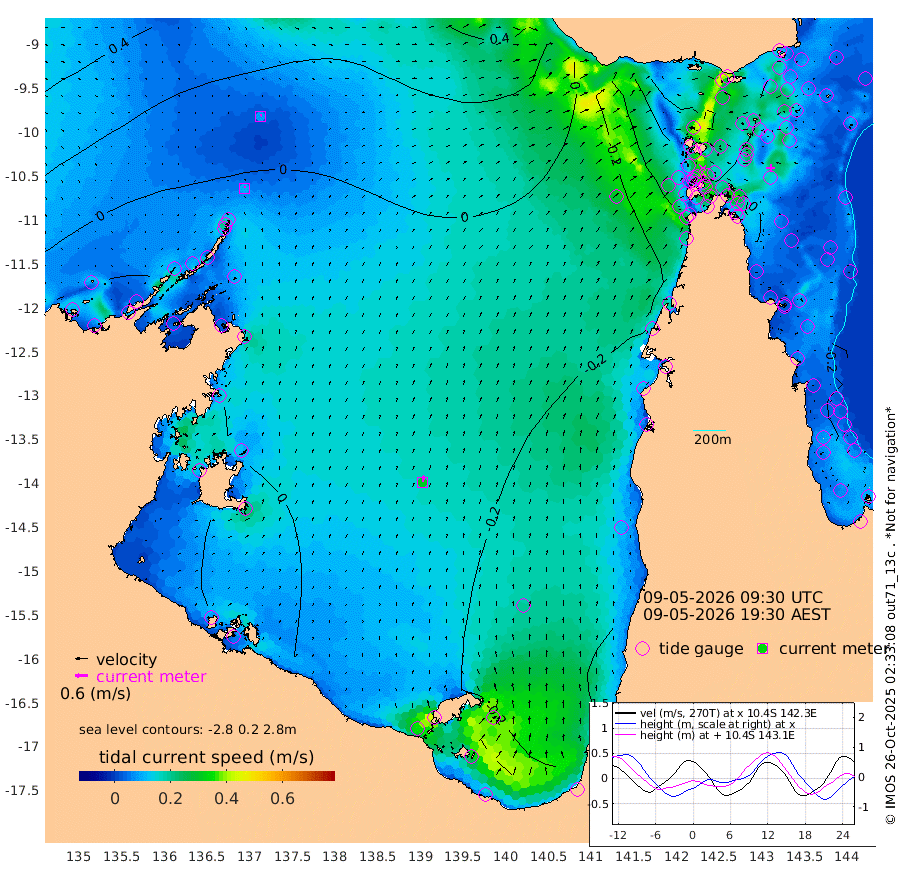 9cm/s 5T +3cm/s rms + 7cm/s -42T. ARA-GOC87 57m 30cm/s 10T +3cm/s rms + 2cm/s -2T. ARA-GOC87 60m 8cm/s 55T +2cm/s rms + 3cm/s 61T. ARA-GOC87 47m -20cm Daru -8cm Bobo Island -19cm Meer Island Barge -14cm Bramble Cay -15cm Unnamed Cay -15cm Pearce Cay -13cm Stephens Island -7cm Merrie England Shoals -13cm Mutacomal Reef -17cm Darnley Island Barge -12cm East Cay -18cm Yorke Island Barge -13cm Rennel Island -13cm Aureed Island -30cm Dungeness Reef -34cm Zagai Island -40cm Yam Island -90cm Dauan Island -66cm Saibai Island -86cm Phipi Reef -53cm Warrior Reef - West -47cm Mabuiag Island Barge -15cm Half Way Island -9cm Coconut Island -20cm Dugong Islet -25cm Poll Island -24cm Kirkcaldie Reef -26cm Suarji Island -23cm Sue Islet -72cm Hawkesbury Island -30cm Alert Patches -27cm Twin Island -68cm Badu Island -37cm St Pauls (Moa Island) -66cm Kubin (Moa Island) -40cm Ince Point -44cm Thursday Island -44cm Nardana Patches -59cm Turtle Head -58cm Round Island -67cm Goods Island -60cm Booby Island -48cm White Rocks Area -14cm Carpentaria -24cm Papou Point -46cm Bampfield Head -46cm Crab Island -54cm Red Wallis Island -67cm Packe Island -3cm Harrington Reef -80cm Herald Camp -8cm Sharp Point -38cm Red Island Point -33cm Possession Island -17cm Alpha Rock -17cm Frederick Point -8cm Wyborn Reef Light -10cm Tetley Island -19cm Triangle Reef -11cm Turtle Head Island -18cm Maclennan Cay -17cm Raine Island -11cm Mcsweeny Reef -11cm Collette Reef -19cm Shadwell Reef -11cm Hannibal Island -11cm Round Point -34cm Vrilya Point -10cm Cape Grenville -16cm Hicks Island -26cm Sir Charles Hardy Island -5cm Harvey Island -8cm Kay Reef -17cm Rocky Island -16cm Chapman Island -14cm Ham Reef -17cm Jubilee Reef -16cm Night Island -11cm Unnamed Reef No. 3 -15cm Morris Island -22cm 1st 3 Mile Opening -17cm Creech Reef -10cm Fife Island -22cm Eden Reef -15cm Stanley Island -11cm Normanby River -27cm Yabooma Island -29cm Hutchison River -16cm Elcho Island -17cm North West Crocodile Island 9cm Cape Wessel -8cm Stevens Island -14cm Guluwuru Island -10cm Hopeful Bay -1cm Auster Point -14cm Two Island Bay -37cm Cadell Strait -28cm Mallison Island -12cm Melville Bay (Gove Harbour) -9cm Truant Island -5cm Cape Arnhem 11cm Cape Grey 7cm Hawk Island 35cm Milner Bay (Groote Eylandt) 28cm Cape Beatrice 46cm West Island 49cm Centre Island -5cm Mornington Island -1cm West Wellesley Islands -24cm Bountiful Island -17cm Albert River Mouth 3cm Sweers Island -24cm Karumba -47cm Nassau River Offshore -62cm Christmas Creek -51cm Archer River -48cm Boyd Point -62cm Weipa (Humbug Point) -31cm Pennefather River -47cm Cullen Point