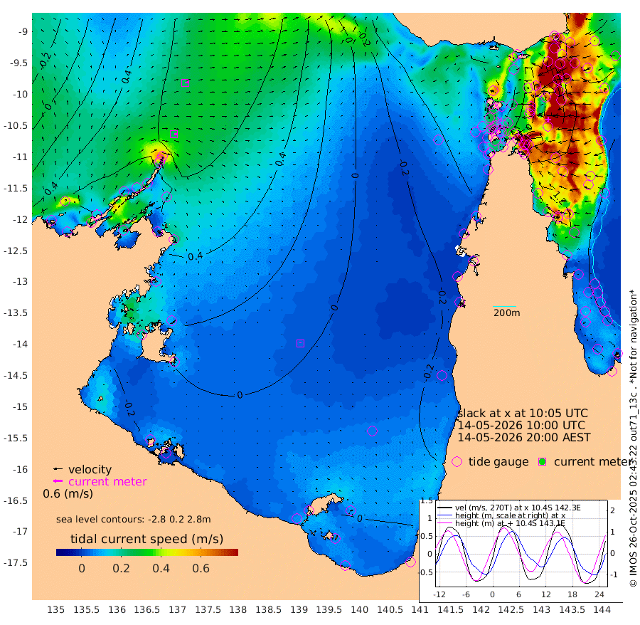 24cm/s 96T +3cm/s rms + 7cm/s -42T. ARA-GOC87 57m 4cm/s -9T +3cm/s rms + 2cm/s -2T. ARA-GOC87 60m 24cm/s 83T +2cm/s rms + 3cm/s 61T. ARA-GOC87 47m 105cm Daru 112cm Bobo Island 101cm Meer Island Barge 120cm Bramble Cay 122cm Unnamed Cay 115cm Pearce Cay 124cm Stephens Island 132cm Merrie England Shoals 108cm Mutacomal Reef 115cm Darnley Island Barge 109cm East Cay 105cm Yorke Island Barge 110cm Rennel Island 99cm Aureed Island 82cm Dungeness Reef 29cm Zagai Island 22cm Yam Island -46cm Dauan Island -50cm Saibai Island -10cm Phipi Reef 18cm Warrior Reef - West -42cm Mabuiag Island Barge 106cm Half Way Island 92cm Coconut Island 93cm Dugong Islet 55cm Poll Island 66cm Kirkcaldie Reef 24cm Suarji Island 47cm Sue Islet -45cm Hawkesbury Island 24cm Alert Patches 24cm Twin Island -44cm Badu Island 7cm St Pauls (Moa Island) -26cm Kubin (Moa Island) -5cm Ince Point -16cm Thursday Island -14cm Nardana Patches -20cm Turtle Head -18cm Round Island -36cm Goods Island -53cm Booby Island -46cm White Rocks Area -56cm Carpentaria 11cm Papou Point -20cm Bampfield Head -41cm Crab Island -57cm Red Wallis Island -31cm Packe Island 105cm Harrington Reef -43cm Herald Camp -6cm Sharp Point -22cm Red Island Point 15cm Possession Island 28cm Alpha Rock 58cm Frederick Point 104cm Wyborn Reef Light 91cm Tetley Island 77cm Triangle Reef 122cm Turtle Head Island 89cm Maclennan Cay 86cm Raine Island 113cm Mcsweeny Reef 113cm Collette Reef 95cm Shadwell Reef 128cm Hannibal Island 125cm Round Point -42cm Vrilya Point 113cm Cape Grenville 109cm Hicks Island 95cm Sir Charles Hardy Island 35cm Harvey Island 110cm Kay Reef 93cm Rocky Island 84cm Chapman Island 81cm Ham Reef 90cm Jubilee Reef 87cm Night Island 84cm Unnamed Reef No. 3 101cm Morris Island 93cm 1st 3 Mile Opening 93cm Creech Reef 100cm Fife Island 113cm Eden Reef 104cm Stanley Island 114cm Normanby River 60cm Yabooma Island 92cm Hutchison River 69cm Elcho Island 55cm North West Crocodile Island 58cm Cape Wessel 78cm Stevens Island 91cm Guluwuru Island 69cm Hopeful Bay 69cm Auster Point 63cm Two Island Bay 90cm Cadell Strait 139cm Mallison Island 78cm Melville Bay (Gove Harbour) 83cm Truant Island 57cm Cape Arnhem 42cm Cape Grey 34cm Hawk Island 6cm Milner Bay (Groote Eylandt) 1cm Cape Beatrice -29cm West Island -26cm Centre Island -6cm Mornington Island -13cm West Wellesley Islands -23cm Bountiful Island -18cm Albert River Mouth -5cm Sweers Island -15cm Karumba -18cm Nassau River Offshore -16cm Christmas Creek -15cm Archer River -23cm Boyd Point -27cm Weipa (Humbug Point) -12cm Pennefather River -48cm Cullen Point