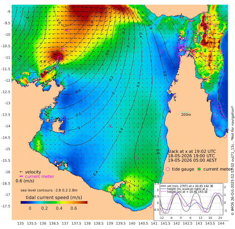 54cm/s -86T +3cm/s rms + 7cm/s -42T. ARA-GOC87 57m 21cm/s 179T +3cm/s rms + 2cm/s -2T. ARA-GOC87 60m 59cm/s -95T +2cm/s rms + 3cm/s 61T. ARA-GOC87 47m -24cm Daru -47cm Bobo Island -39cm Meer Island Barge -48cm Bramble Cay -36cm Unnamed Cay -51cm Pearce Cay -45cm Stephens Island -40cm Merrie England Shoals -23cm Mutacomal Reef -43cm Darnley Island Barge -39cm East Cay -35cm Yorke Island Barge -28cm Rennel Island -33cm Aureed Island -8cm Dungeness Reef 16cm Zagai Island 29cm Yam Island 81cm Dauan Island 74cm Saibai Island 75cm Phipi Reef 33cm Warrior Reef - West 79cm Mabuiag Island Barge -32cm Half Way Island -16cm Coconut Island -19cm Dugong Islet 6cm Poll Island 10cm Kirkcaldie Reef 46cm Suarji Island 13cm Sue Islet 104cm Hawkesbury Island 55cm Alert Patches 41cm Twin Island 100cm Badu Island 51cm St Pauls (Moa Island) 84cm Kubin (Moa Island) 68cm Ince Point 81cm Thursday Island 78cm Nardana Patches 95cm Turtle Head 98cm Round Island 107cm Goods Island 125cm Booby Island 113cm White Rocks Area 114cm Carpentaria 33cm Papou Point 124cm Bampfield Head 107cm Crab Island 121cm Red Wallis Island 105cm Packe Island -22cm Harrington Reef 135cm Herald Camp 22cm Sharp Point 78cm Red Island Point 61cm Possession Island 32cm Alpha Rock 14cm Frederick Point -26cm Wyborn Reef Light -17cm Tetley Island -23cm Triangle Reef -42cm Turtle Head Island -26cm Maclennan Cay -24cm Raine Island -33cm Mcsweeny Reef -31cm Collette Reef -24cm Shadwell Reef -42cm Hannibal Island -46cm Round Point 105cm Vrilya Point -32cm Cape Grenville -36cm Hicks Island -23cm Sir Charles Hardy Island -10cm Harvey Island -32cm Kay Reef -27cm Rocky Island -23cm Chapman Island -22cm Ham Reef -28cm Jubilee Reef -24cm Night Island -22cm Unnamed Reef No. 3 -32cm Morris Island -23cm 1st 3 Mile Opening -26cm Creech Reef -30cm Fife Island -46cm Eden Reef -29cm Stanley Island -46cm Normanby River -206cm Yabooma Island -259cm Hutchison River -221cm Elcho Island -208cm North West Crocodile Island -181cm Cape Wessel -218cm Stevens Island -191cm Guluwuru Island -187cm Hopeful Bay -186cm Auster Point -197cm Two Island Bay -259cm Cadell Strait -187cm Mallison Island -165cm Melville Bay (Gove Harbour) -176cm Truant Island -113cm Cape Arnhem -77cm Cape Grey -55cm Hawk Island -23cm Milner Bay (Groote Eylandt) -6cm Cape Beatrice 47cm West Island 49cm Centre Island 61cm Mornington Island 65cm West Wellesley Islands 73cm Bountiful Island 36cm Albert River Mouth 28cm Sweers Island 56cm Karumba 89cm Nassau River Offshore 102cm Christmas Creek 91cm Archer River 91cm Boyd Point 102cm Weipa (Humbug Point) 78cm Pennefather River 111cm Cullen Point