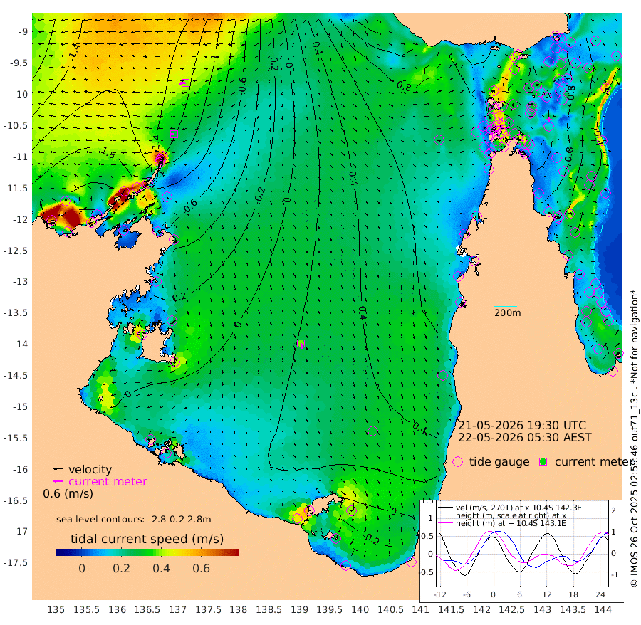 26cm/s -92T +3cm/s rms + 7cm/s -42T. ARA-GOC87 57m 38cm/s 166T +3cm/s rms + 2cm/s -2T. ARA-GOC87 60m 40cm/s -98T +2cm/s rms + 3cm/s 61T. ARA-GOC87 47m 99cm Daru 80cm Bobo Island 47cm Meer Island Barge 59cm Bramble Cay 84cm Unnamed Cay 75cm Pearce Cay 78cm Stephens Island 85cm Merrie England Shoals 99cm Mutacomal Reef 73cm Darnley Island Barge 52cm East Cay 84cm Yorke Island Barge 90cm Rennel Island 81cm Aureed Island 97cm Dungeness Reef 89cm Zagai Island 106cm Yam Island 96cm Dauan Island 92cm Saibai Island 96cm Phipi Reef 105cm Warrior Reef - West 87cm Mabuiag Island Barge 94cm Half Way Island 92cm Coconut Island 105cm Dugong Islet 99cm Poll Island 116cm Kirkcaldie Reef 100cm Suarji Island 103cm Sue Islet 96cm Hawkesbury Island 112cm Alert Patches 109cm Twin Island 85cm Badu Island 112cm St Pauls (Moa Island) 95cm Kubin (Moa Island) 106cm Ince Point 105cm Thursday Island 104cm Nardana Patches 101cm Turtle Head 83cm Round Island 88cm Goods Island 89cm Booby Island 81cm White Rocks Area 88cm Carpentaria 92cm Papou Point 79cm Bampfield Head 81cm Crab Island 94cm Red Wallis Island 104cm Packe Island 108cm Harrington Reef 107cm Herald Camp 38cm Sharp Point 92cm Red Island Point 89cm Possession Island 101cm Alpha Rock 108cm Frederick Point 92cm Wyborn Reef Light 95cm Tetley Island 49cm Triangle Reef 95cm Turtle Head Island 55cm Maclennan Cay 34cm Raine Island 82cm Mcsweeny Reef 74cm Collette Reef 52cm Shadwell Reef 75cm Hannibal Island 62cm Round Point 88cm Vrilya Point 65cm Cape Grenville 56cm Hicks Island 64cm Sir Charles Hardy Island 21cm Harvey Island 53cm Kay Reef 42cm Rocky Island 35cm Chapman Island 39cm Ham Reef 42cm Jubilee Reef 43cm Night Island 41cm Unnamed Reef No. 3 43cm Morris Island 40cm 1st 3 Mile Opening 45cm Creech Reef 48cm Fife Island 35cm Eden Reef 48cm Stanley Island 44cm Normanby River -214cm Yabooma Island -252cm Hutchison River -229cm Elcho Island -217cm North West Crocodile Island -144cm Cape Wessel -201cm Stevens Island -117cm Guluwuru Island -188cm Hopeful Bay -164cm Auster Point -160cm Two Island Bay -197cm Cadell Strait -29cm Mallison Island -116cm Melville Bay (Gove Harbour) -120cm Truant Island -77cm Cape Arnhem -62cm Cape Grey -59cm Hawk Island -55cm Milner Bay (Groote Eylandt) -36cm Cape Beatrice -1cm West Island -7cm Centre Island 9cm Mornington Island 13cm West Wellesley Islands -10cm Bountiful Island -71cm Albert River Mouth -91cm Sweers Island -45cm Karumba 56cm Nassau River Offshore 86cm Christmas Creek 74cm Archer River 78cm Boyd Point 74cm Weipa (Humbug Point) 72cm Pennefather River 84cm Cullen Point