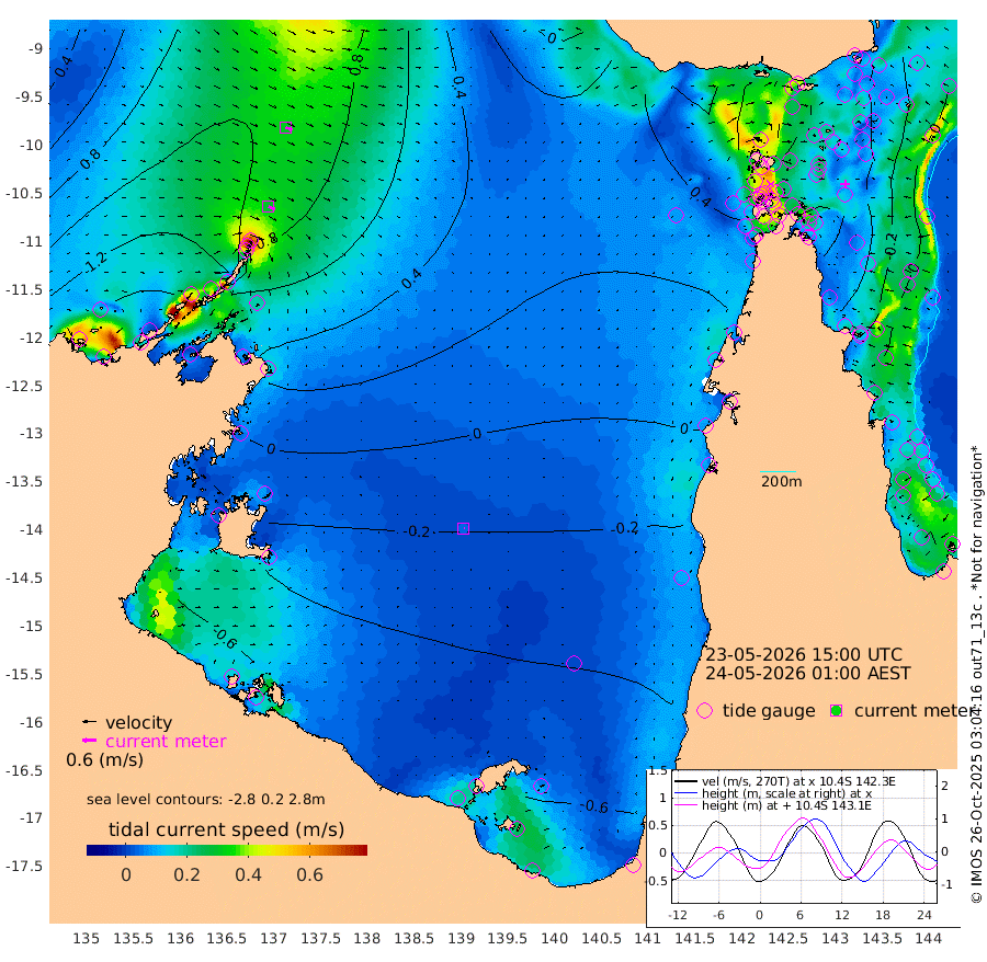 30cm/s 118T +3cm/s rms + 7cm/s -42T. ARA-GOC87 57m 4cm/s 86T +3cm/s rms + 2cm/s -2T. ARA-GOC87 60m 31cm/s 111T +2cm/s rms + 3cm/s 61T. ARA-GOC87 47m -35cm Daru -28cm Bobo Island 0cm Meer Island Barge -11cm Bramble Cay -25cm Unnamed Cay -22cm Pearce Cay -25cm Stephens Island -33cm Merrie England Shoals -34cm Mutacomal Reef -19cm Darnley Island Barge -2cm East Cay -24cm Yorke Island Barge -29cm Rennel Island -27cm Aureed Island -27cm Dungeness Reef -10cm Zagai Island -10cm Yam Island 27cm Dauan Island 27cm Saibai Island 2cm Phipi Reef -12cm Warrior Reef - West 32cm Mabuiag Island Barge -34cm Half Way Island -27cm Coconut Island -34cm Dugong Islet -22cm Poll Island -32cm Kirkcaldie Reef -14cm Suarji Island -20cm Sue Islet 92cm Hawkesbury Island -8cm Alert Patches -8cm Twin Island 78cm Badu Island -7cm St Pauls (Moa Island) 60cm Kubin (Moa Island) 13cm Ince Point 26cm Thursday Island 24cm Nardana Patches 46cm Turtle Head 71cm Round Island 81cm Goods Island 93cm Booby Island 88cm White Rocks Area 72cm Carpentaria 3cm Papou Point 116cm Bampfield Head 69cm Crab Island 83cm Red Wallis Island 61cm Packe Island -43cm Harrington Reef 92cm Herald Camp -15cm Sharp Point 39cm Red Island Point 21cm Possession Island -11cm Alpha Rock -21cm Frederick Point -24cm Wyborn Reef Light -22cm Tetley Island 5cm Triangle Reef -25cm Turtle Head Island 0cm Maclennan Cay 13cm Raine Island -26cm Mcsweeny Reef -20cm Collette Reef -2cm Shadwell Reef -24cm Hannibal Island -11cm Round Point 53cm Vrilya Point -13cm Cape Grenville -4cm Hicks Island 10cm Sir Charles Hardy Island -5cm Harvey Island -2cm Kay Reef 8cm Rocky Island 19cm Chapman Island 16cm Ham Reef 9cm Jubilee Reef 0cm Night Island 11cm Unnamed Reef No. 3 5cm Morris Island 12cm 1st 3 Mile Opening 6cm Creech Reef -4cm Fife Island 13cm Eden Reef 3cm Stanley Island 2cm Normanby River 169cm Yabooma Island 184cm Hutchison River 156cm Elcho Island 146cm North West Crocodile Island 121cm Cape Wessel 144cm Stevens Island 101cm Guluwuru Island 135cm Hopeful Bay 126cm Auster Point 128cm Two Island Bay 153cm Cadell Strait 87cm Mallison Island 90cm Melville Bay (Gove Harbour) 102cm Truant Island 57cm Cape Arnhem 16cm Cape Grey -4cm Hawk Island -41cm Milner Bay (Groote Eylandt) -59cm Cape Beatrice -109cm West Island -107cm Centre Island -123cm Mornington Island -120cm West Wellesley Islands -116cm Bountiful Island -137cm Albert River Mouth -151cm Sweers Island -142cm Karumba -89cm Nassau River Offshore -46cm Christmas Creek 5cm Archer River 27cm Boyd Point 37cm Weipa (Humbug Point) 17cm Pennefather River 56cm Cullen Point