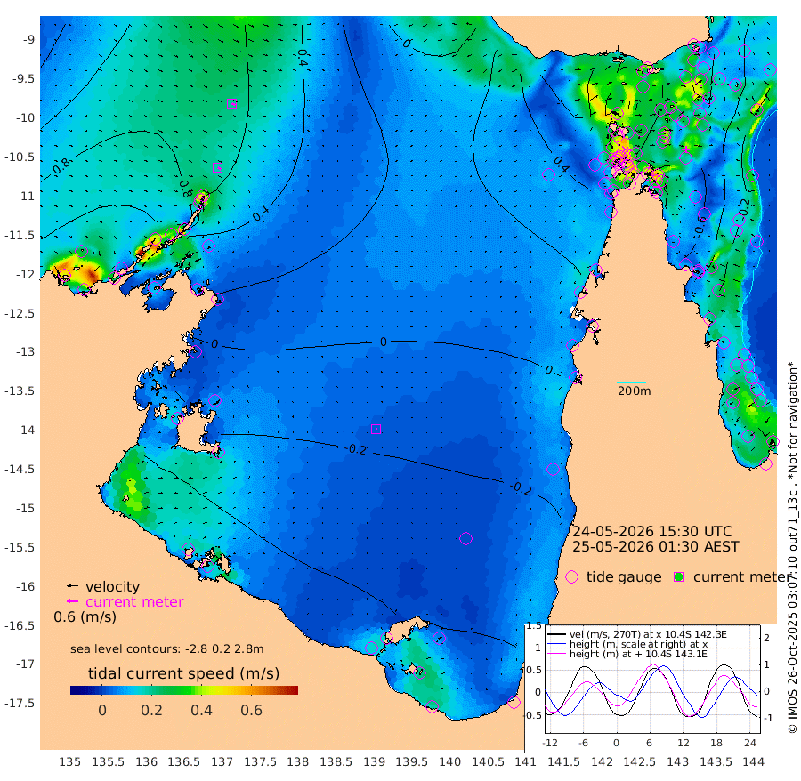 18cm/s 124T +3cm/s rms + 7cm/s -42T. ARA-GOC87 57m 3cm/s 46T +3cm/s rms + 2cm/s -2T. ARA-GOC87 60m 20cm/s 116T +2cm/s rms + 3cm/s 61T. ARA-GOC87 47m -54cm Daru -53cm Bobo Island -20cm Meer Island Barge -34cm Bramble Cay -46cm Unnamed Cay -50cm Pearce Cay -49cm Stephens Island -54cm Merrie England Shoals -52cm Mutacomal Reef -41cm Darnley Island Barge -24cm East Cay -45cm Yorke Island Barge -49cm Rennel Island -49cm Aureed Island -44cm Dungeness Reef -19cm Zagai Island -18cm Yam Island 31cm Dauan Island 30cm Saibai Island 4cm Phipi Reef -19cm Warrior Reef - West 34cm Mabuiag Island Barge -55cm Half Way Island -46cm Coconut Island -52cm Dugong Islet -35cm Poll Island -45cm Kirkcaldie Reef -19cm Suarji Island -30cm Sue Islet 87cm Hawkesbury Island -14cm Alert Patches -16cm Twin Island 75cm Badu Island -12cm St Pauls (Moa Island) 55cm Kubin (Moa Island) 9cm Ince Point 23cm Thursday Island 21cm Nardana Patches 44cm Turtle Head 70cm Round Island 78cm Goods Island 92cm Booby Island 86cm White Rocks Area 73cm Carpentaria -5cm Papou Point 115cm Bampfield Head 68cm Crab Island 81cm Red Wallis Island 57cm Packe Island -63cm Harrington Reef 94cm Herald Camp -13cm Sharp Point 32cm Red Island Point 16cm Possession Island -17cm Alpha Rock -35cm Frederick Point -43cm Wyborn Reef Light -39cm Tetley Island -12cm Triangle Reef -49cm Turtle Head Island -18cm Maclennan Cay -4cm Raine Island -46cm Mcsweeny Reef -40cm Collette Reef -18cm Shadwell Reef -46cm Hannibal Island -35cm Round Point 53cm Vrilya Point -33cm Cape Grenville -24cm Hicks Island -9cm Sir Charles Hardy Island -11cm Harvey Island -22cm Kay Reef -10cm Rocky Island 1cm Chapman Island -1cm Ham Reef -9cm Jubilee Reef -17cm Night Island -7cm Unnamed Reef No. 3 -14cm Morris Island -5cm 1st 3 Mile Opening -12cm Creech Reef -22cm Fife Island -10cm Eden Reef -16cm Stanley Island -21cm Normanby River 136cm Yabooma Island 140cm Hutchison River 121cm Elcho Island 113cm North West Crocodile Island 89cm Cape Wessel 110cm Stevens Island 67cm Guluwuru Island 106cm Hopeful Bay 95cm Auster Point 95cm Two Island Bay 106cm Cadell Strait 52cm Mallison Island 62cm Melville Bay (Gove Harbour) 71cm Truant Island 38cm Cape Arnhem 8cm Cape Grey -6cm Hawk Island -30cm Milner Bay (Groote Eylandt) -46cm Cape Beatrice -83cm West Island -80cm Centre Island -97cm Mornington Island -93cm West Wellesley Islands -84cm Bountiful Island -102cm Albert River Mouth -114cm Sweers Island -108cm Karumba -71cm Nassau River Offshore -35cm Christmas Creek 9cm Archer River 29cm Boyd Point 40cm Weipa (Humbug Point) 16cm Pennefather River 59cm Cullen Point