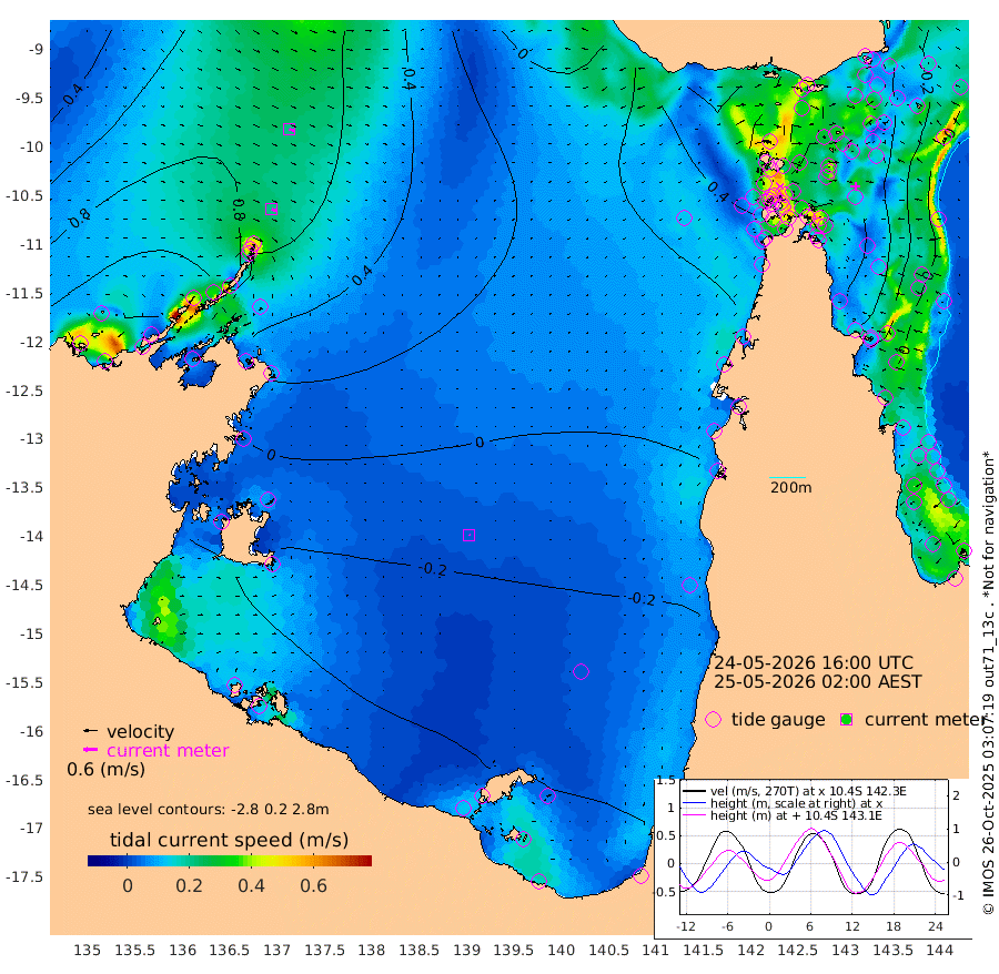 21cm/s 119T +3cm/s rms + 7cm/s -42T. ARA-GOC87 57m 3cm/s 137T +3cm/s rms + 2cm/s -2T. ARA-GOC87 60m 21cm/s 111T +2cm/s rms + 3cm/s 61T. ARA-GOC87 47m -45cm Daru -42cm Bobo Island -4cm Meer Island Barge -18cm Bramble Cay -34cm Unnamed Cay -37cm Pearce Cay -34cm Stephens Island -41cm Merrie England Shoals -44cm Mutacomal Reef -26cm Darnley Island Barge -7cm East Cay -33cm Yorke Island Barge -39cm Rennel Island -39cm Aureed Island -39cm Dungeness Reef -22cm Zagai Island -21cm Yam Island 24cm Dauan Island 24cm Saibai Island -5cm Phipi Reef -20cm Warrior Reef - West 23cm Mabuiag Island Barge -45cm Half Way Island -42cm Coconut Island -45cm Dugong Islet -35cm Poll Island -45cm Kirkcaldie Reef -27cm Suarji Island -30cm Sue Islet 76cm Hawkesbury Island -22cm Alert Patches -23cm Twin Island 62cm Badu Island -20cm St Pauls (Moa Island) 46cm Kubin (Moa Island) 0cm Ince Point 13cm Thursday Island 10cm Nardana Patches 34cm Turtle Head 58cm Round Island 67cm Goods Island 79cm Booby Island 73cm White Rocks Area 60cm Carpentaria -13cm Papou Point 101cm Bampfield Head 57cm Crab Island 70cm Red Wallis Island 48cm Packe Island -58cm Harrington Reef 83cm Herald Camp -16cm Sharp Point 24cm Red Island Point 6cm Possession Island -21cm Alpha Rock -35cm Frederick Point -37cm Wyborn Reef Light -35cm Tetley Island 0cm Triangle Reef -43cm Turtle Head Island -4cm Maclennan Cay 10cm Raine Island -34cm Mcsweeny Reef -27cm Collette Reef -4cm Shadwell Reef -31cm Hannibal Island -18cm Round Point 42cm Vrilya Point -18cm Cape Grenville -9cm Hicks Island 8cm Sir Charles Hardy Island -6cm Harvey Island -5cm Kay Reef 6cm Rocky Island 18cm Chapman Island 15cm Ham Reef 7cm Jubilee Reef -3cm Night Island 10cm Unnamed Reef No. 3 2cm Morris Island 9cm 1st 3 Mile Opening 4cm Creech Reef -3cm Fife Island 10cm Eden Reef 2cm Stanley Island -1cm Normanby River 141cm Yabooma Island 145cm Hutchison River 124cm Elcho Island 115cm North West Crocodile Island 99cm Cape Wessel 117cm Stevens Island 81cm Guluwuru Island 113cm Hopeful Bay 102cm Auster Point 104cm Two Island Bay 121cm Cadell Strait 96cm Mallison Island 73cm Melville Bay (Gove Harbour) 83cm Truant Island 46cm Cape Arnhem 12cm Cape Grey -5cm Hawk Island -34cm Milner Bay (Groote Eylandt) -50cm Cape Beatrice -90cm West Island -90cm Centre Island -98cm Mornington Island -93cm West Wellesley Islands -83cm Bountiful Island -106cm Albert River Mouth -118cm Sweers Island -111cm Karumba -66cm Nassau River Offshore -29cm Christmas Creek 11cm Archer River 29cm Boyd Point 39cm Weipa (Humbug Point) 11cm Pennefather River 51cm Cullen Point