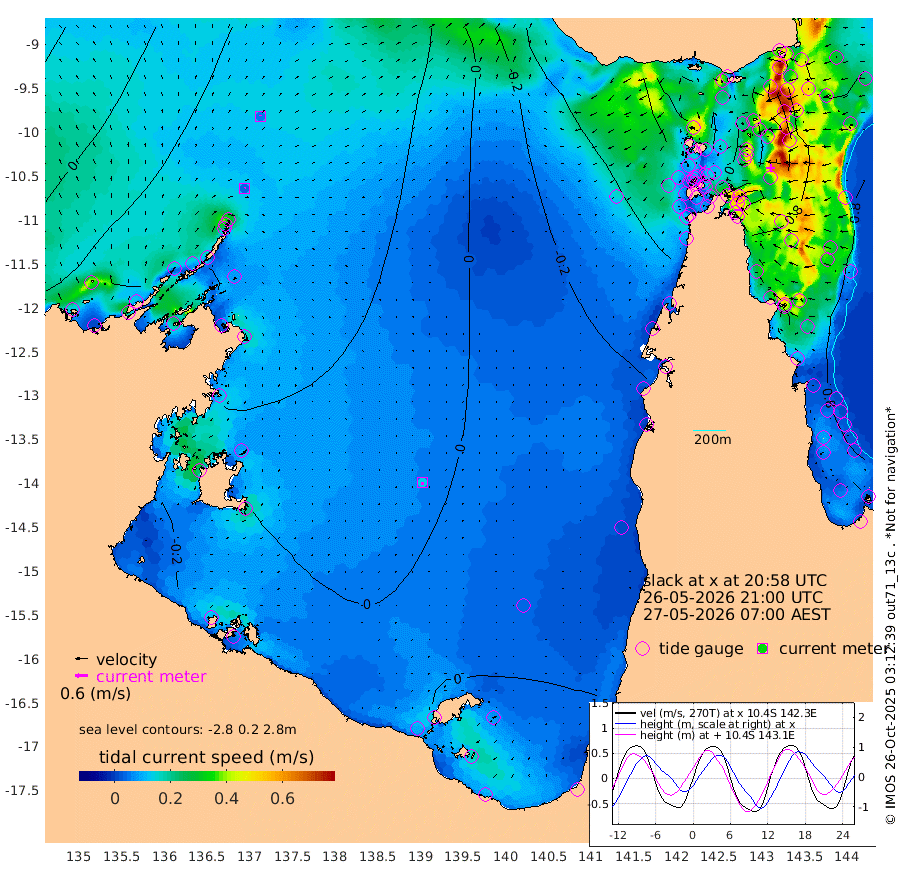 4cm/s 37T +3cm/s rms + 7cm/s -42T. ARA-GOC87 57m 14cm/s -179T +3cm/s rms + 2cm/s -2T. ARA-GOC87 60m 6cm/s 4T +2cm/s rms + 3cm/s 61T. ARA-GOC87 47m 68cm Daru 76cm Bobo Island 72cm Meer Island Barge 87cm Bramble Cay 82cm Unnamed Cay 78cm Pearce Cay 85cm Stephens Island 88cm Merrie England Shoals 76cm Mutacomal Reef 80cm Darnley Island Barge 86cm East Cay 70cm Yorke Island Barge 72cm Rennel Island 68cm Aureed Island 49cm Dungeness Reef 13cm Zagai Island 21cm Yam Island -26cm Dauan Island -20cm Saibai Island -21cm Phipi Reef 19cm Warrior Reef - West -34cm Mabuiag Island Barge 70cm Half Way Island 51cm Coconut Island 64cm Dugong Islet 32cm Poll Island 38cm Kirkcaldie Reef 0cm Suarji Island 27cm Sue Islet -32cm Hawkesbury Island -7cm Alert Patches 5cm Twin Island -49cm Badu Island -8cm St Pauls (Moa Island) -21cm Kubin (Moa Island) -16cm Ince Point -25cm Thursday Island -24cm Nardana Patches -30cm Turtle Head -28cm Round Island -40cm Goods Island -56cm Booby Island -47cm White Rocks Area -56cm Carpentaria -3cm Papou Point -48cm Bampfield Head -53cm Crab Island -44cm Red Wallis Island -17cm Packe Island 64cm Harrington Reef -22cm Herald Camp -6cm Sharp Point -22cm Red Island Point -14cm Possession Island 18cm Alpha Rock 32cm Frederick Point 66cm Wyborn Reef Light 58cm Tetley Island 61cm Triangle Reef 59cm Turtle Head Island 70cm Maclennan Cay 61cm Raine Island 76cm Mcsweeny Reef 75cm Collette Reef 65cm Shadwell Reef 85cm Hannibal Island 92cm Round Point -56cm Vrilya Point 84cm Cape Grenville 80cm Hicks Island 87cm Sir Charles Hardy Island 26cm Harvey Island 85cm Kay Reef 74cm Rocky Island 72cm Chapman Island 70cm Ham Reef 69cm Jubilee Reef 66cm Night Island 71cm Unnamed Reef No. 3 76cm Morris Island 58cm 1st 3 Mile Opening 69cm Creech Reef 84cm Fife Island 87cm Eden Reef 78cm Stanley Island 94cm Normanby River 47cm Yabooma Island 53cm Hutchison River 40cm Elcho Island 40cm North West Crocodile Island 53cm Cape Wessel 51cm Stevens Island 58cm Guluwuru Island 51cm Hopeful Bay 41cm Auster Point 53cm Two Island Bay 68cm Cadell Strait 143cm Mallison Island 50cm Melville Bay (Gove Harbour) 52cm Truant Island 32cm Cape Arnhem 12cm Cape Grey 11cm Hawk Island -14cm Milner Bay (Groote Eylandt) -10cm Cape Beatrice -25cm West Island -33cm Centre Island -2cm Mornington Island -5cm West Wellesley Islands 8cm Bountiful Island -15cm Albert River Mouth -20cm Sweers Island -7cm Karumba 17cm Nassau River Offshore 17cm Christmas Creek -7cm Archer River -14cm Boyd Point -13cm Weipa (Humbug Point) -40cm Pennefather River -36cm Cullen Point