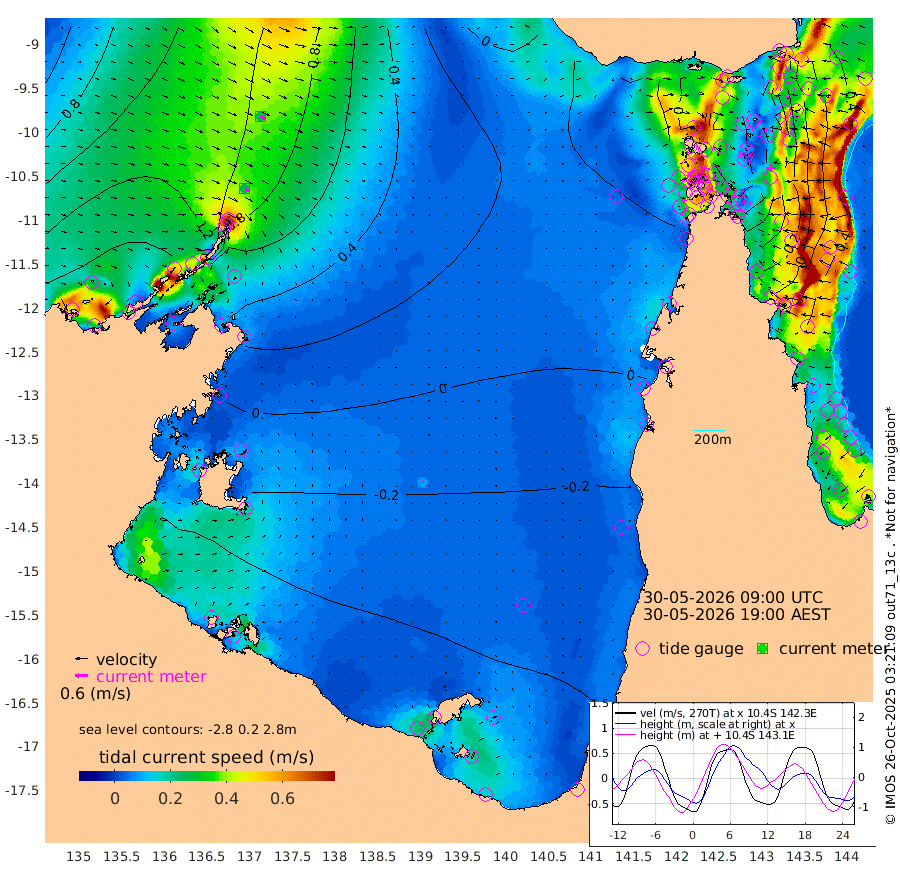 26cm/s 121T +3cm/s rms + 7cm/s -42T. ARA-GOC87 57m 8cm/s 10T +3cm/s rms + 2cm/s -2T. ARA-GOC87 60m 27cm/s 115T +2cm/s rms + 3cm/s 61T. ARA-GOC87 47m -30cm Daru -23cm Bobo Island 26cm Meer Island Barge 21cm Bramble Cay -3cm Unnamed Cay -11cm Pearce Cay 1cm Stephens Island 8cm Merrie England Shoals -24cm Mutacomal Reef 2cm Darnley Island Barge 29cm East Cay -18cm Yorke Island Barge -16cm Rennel Island -31cm Aureed Island -42cm Dungeness Reef -72cm Zagai Island -73cm Yam Island -87cm Dauan Island -85cm Saibai Island -79cm Phipi Reef -84cm Warrior Reef - West -51cm Mabuiag Island Barge -21cm Half Way Island -33cm Coconut Island -37cm Dugong Islet -55cm Poll Island -49cm Kirkcaldie Reef -78cm Suarji Island -55cm Sue Islet 33cm Hawkesbury Island -48cm Alert Patches -55cm Twin Island 14cm Badu Island -70cm St Pauls (Moa Island) -3cm Kubin (Moa Island) -42cm Ince Point -30cm Thursday Island -34cm Nardana Patches -8cm Turtle Head 19cm Round Island 30cm Goods Island 47cm Booby Island 38cm White Rocks Area 35cm Carpentaria -49cm Papou Point 65cm Bampfield Head 46cm Crab Island 33cm Red Wallis Island 6cm Packe Island -37cm Harrington Reef 23cm Herald Camp -33cm Sharp Point -1cm Red Island Point -21cm Possession Island -51cm Alpha Rock -46cm Frederick Point -22cm Wyborn Reef Light -29cm Tetley Island 12cm Triangle Reef -6cm Turtle Head Island 17cm Maclennan Cay 42cm Raine Island -4cm Mcsweeny Reef 6cm Collette Reef 25cm Shadwell Reef 10cm Hannibal Island 27cm Round Point 47cm Vrilya Point 22cm Cape Grenville 25cm Hicks Island 17cm Sir Charles Hardy Island 5cm Harvey Island 38cm Kay Reef 35cm Rocky Island 40cm Chapman Island 39cm Ham Reef 37cm Jubilee Reef 28cm Night Island 39cm Unnamed Reef No. 3 40cm Morris Island 40cm 1st 3 Mile Opening 36cm Creech Reef 35cm Fife Island 51cm Eden Reef 42cm Stanley Island 43cm Normanby River 150cm Yabooma Island 173cm Hutchison River 153cm Elcho Island 141cm North West Crocodile Island 91cm Cape Wessel 139cm Stevens Island 77cm Guluwuru Island 132cm Hopeful Bay 112cm Auster Point 109cm Two Island Bay 136cm Cadell Strait 75cm Mallison Island 73cm Melville Bay (Gove Harbour) 79cm Truant Island 42cm Cape Arnhem 19cm Cape Grey 6cm Hawk Island -24cm Milner Bay (Groote Eylandt) -35cm Cape Beatrice -79cm West Island -75cm Centre Island -87cm Mornington Island -95cm West Wellesley Islands -104cm Bountiful Island -98cm Albert River Mouth -91cm Sweers Island -93cm Karumba -74cm Nassau River Offshore -48cm Christmas Creek 7cm Archer River 11cm Boyd Point 16cm Weipa (Humbug Point) 37cm Pennefather River 28cm Cullen Point