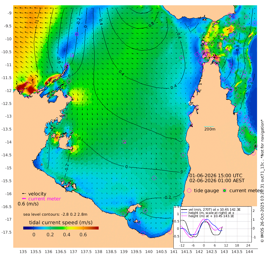12cm/s 122T +3cm/s rms + 7cm/s -42T. ARA-GOC87 57m 28cm/s 161T +3cm/s rms + 2cm/s -2T. ARA-GOC87 60m 3cm/s 153T +2cm/s rms + 3cm/s 61T. ARA-GOC87 47m 113cm Daru 113cm Bobo Island 59cm Meer Island Barge 75cm Bramble Cay 98cm Unnamed Cay 107cm Pearce Cay 91cm Stephens Island 92cm Merrie England Shoals 113cm Mutacomal Reef 90cm Darnley Island Barge 65cm East Cay 104cm Yorke Island Barge 104cm Rennel Island 113cm Aureed Island 114cm Dungeness Reef 127cm Zagai Island 122cm Yam Island 128cm Dauan Island 130cm Saibai Island 125cm Phipi Reef 136cm Warrior Reef - West 106cm Mabuiag Island Barge 98cm Half Way Island 121cm Coconut Island 110cm Dugong Islet 120cm Poll Island 114cm Kirkcaldie Reef 133cm Suarji Island 122cm Sue Islet 90cm Hawkesbury Island 125cm Alert Patches 126cm Twin Island 92cm Badu Island 127cm St Pauls (Moa Island) 95cm Kubin (Moa Island) 112cm Ince Point 105cm Thursday Island 107cm Nardana Patches 98cm Turtle Head 92cm Round Island 80cm Goods Island 69cm Booby Island 69cm White Rocks Area 64cm Carpentaria 109cm Papou Point 96cm Bampfield Head 53cm Crab Island 73cm Red Wallis Island 94cm Packe Island 119cm Harrington Reef 93cm Herald Camp 36cm Sharp Point 85cm Red Island Point 108cm Possession Island 116cm Alpha Rock 125cm Frederick Point 120cm Wyborn Reef Light 123cm Tetley Island 72cm Triangle Reef 114cm Turtle Head Island 64cm Maclennan Cay 43cm Raine Island 95cm Mcsweeny Reef 89cm Collette Reef 64cm Shadwell Reef 91cm Hannibal Island 80cm Round Point 45cm Vrilya Point 71cm Cape Grenville 66cm Hicks Island 78cm Sir Charles Hardy Island 22cm Harvey Island 61cm Kay Reef 53cm Rocky Island 57cm Chapman Island 52cm Ham Reef 51cm Jubilee Reef 49cm Night Island 53cm Unnamed Reef No. 3 50cm Morris Island 46cm 1st 3 Mile Opening 52cm Creech Reef 52cm Fife Island 51cm Eden Reef 50cm Stanley Island 50cm Normanby River -94cm Yabooma Island -95cm Hutchison River -101cm Elcho Island -105cm North West Crocodile Island -19cm Cape Wessel -69cm Stevens Island 11cm Guluwuru Island -64cm Hopeful Bay -40cm Auster Point -48cm Two Island Bay -52cm Cadell Strait 122cm Mallison Island -2cm Melville Bay (Gove Harbour) 7cm Truant Island 8cm Cape Arnhem -14cm Cape Grey -18cm Hawk Island -53cm Milner Bay (Groote Eylandt) -55cm Cape Beatrice -68cm West Island -63cm Centre Island -52cm Mornington Island -50cm West Wellesley Islands -74cm Bountiful Island -135cm Albert River Mouth -141cm Sweers Island -118cm Karumba -17cm Nassau River Offshore 26cm Christmas Creek 38cm Archer River 52cm Boyd Point 45cm Weipa (Humbug Point) 35cm Pennefather River 53cm Cullen Point