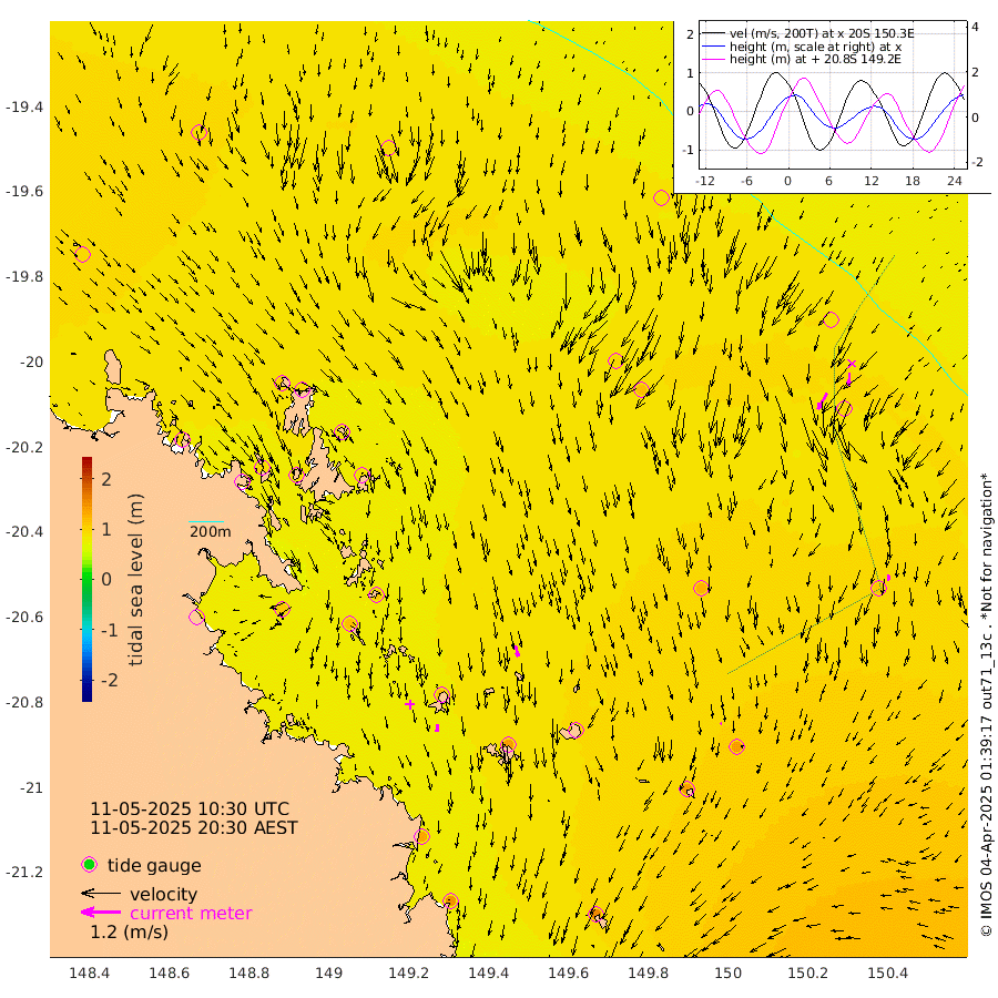 22cm/s -173T +10cm/s rms + 2cm/s 5T. Brampton I 18m 36cm/s 168T +9cm/s rms + 6cm/s 66T. Wigton I 38m 5cm/s -130T +7cm/s rms + 8cm/s 141T. Tern I 47m 37cm/s -177T +7cm/s rms + 12cm/s 54T. N Bugatti Rf 64m 55cm/s -151T +3cm/s rms + 13cm/s 178T. W Bugatti Rf 70m 18cm/s 172T +3cm/s rms + 3cm/s -130T. Creal Rf 69m 93cm Holbourne I 140cm Tern I 95cm Bugatti Rf 112cm Creal Rf 87cm White Tip I 85cm Wallaby Reef 94cm Kennedy Reef 85cm Unnamed Reef No. 2 91cm Tideway Reef 102cm Hayman Island 118cm Square Reef 96cm Double Bay 91cm Molle Island 101cm Cid Harbour 95cm Hook Island 90cm Border Island 86cm Haslewood Island 98cm Shute Harbour 106cm Thomas Island 123cm Credlin Reef 106cm East Repulse Island 113cm Blacksmith Island 106cm Laguna Quays 114cm Carlisle Island (Off) 139cm St. Bees Island 125cm Scawfell Island 140cm Penrith Island 132cm Mackay Outer Harbour 144cm Hay Point 155cm Prudhoe Island