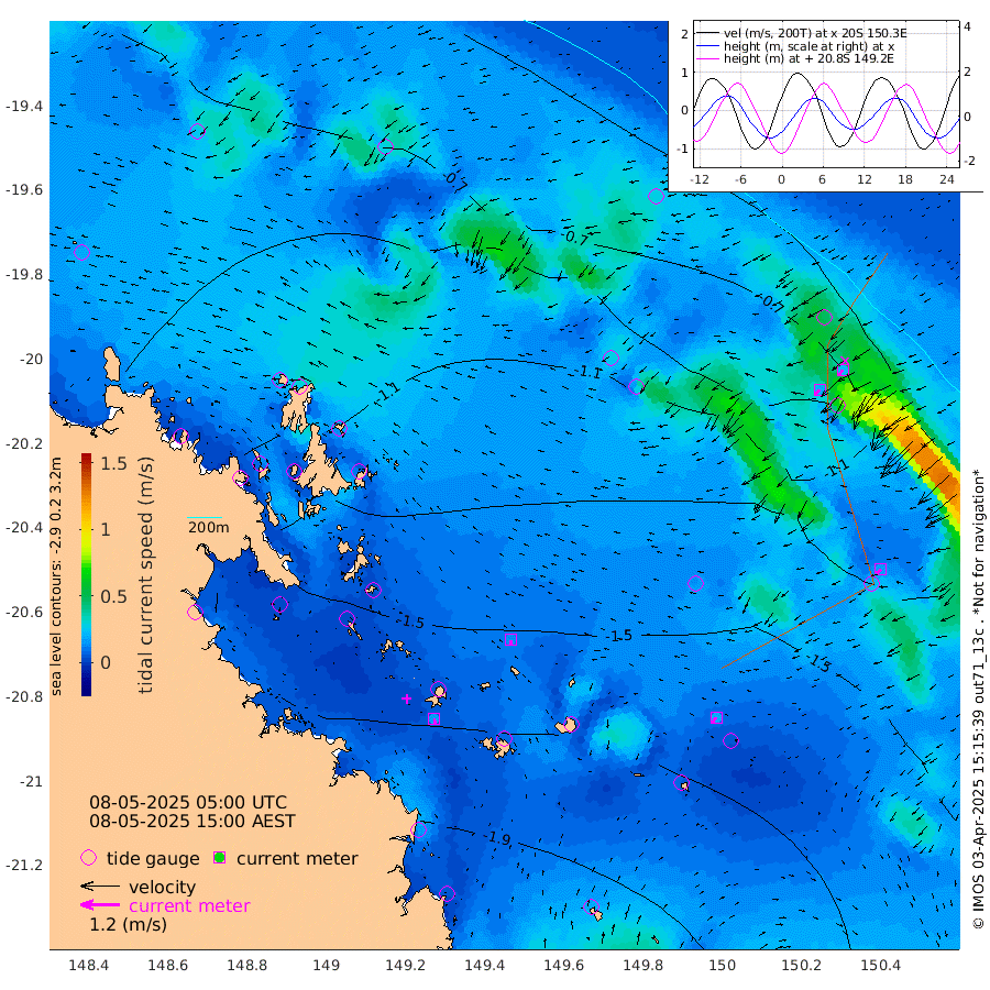 17cm/s 165T +10cm/s rms + 2cm/s 5T. Brampton I 18m 13cm/s -168T +9cm/s rms + 6cm/s 66T. Wigton I 38m 19cm/s -145T +7cm/s rms + 8cm/s 141T. Tern I 47m 23cm/s -145T +7cm/s rms + 12cm/s 54T. N Bugatti Rf 64m 20cm/s -122T +3cm/s rms + 13cm/s 178T. W Bugatti Rf 70m 16cm/s -128T +3cm/s rms + 3cm/s -130T. Creal Rf 69m -91cm Holbourne I -177cm Tern I -94cm Bugatti Rf -128cm Creal Rf -70cm White Tip I -82cm Wallaby Reef -64cm Kennedy Reef -59cm Unnamed Reef No. 2 -119cm Tideway Reef -104cm Hayman Island -149cm Square Reef -124cm Double Bay -134cm Molle Island -127cm Cid Harbour -113cm Hook Island -117cm Border Island -130cm Haslewood Island -132cm Shute Harbour -160cm Thomas Island -160cm Credlin Reef -174cm East Repulse Island -161cm Blacksmith Island -183cm Laguna Quays -174cm Carlisle Island (Off) -189cm St. Bees Island -165cm Scawfell Island -177cm Penrith Island -203cm Mackay Outer Harbour -213cm Hay Point -219cm Prudhoe Island
