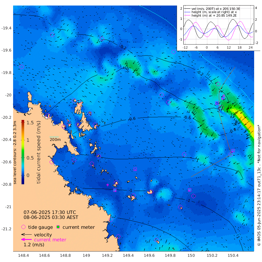 14cm/s 155T +10cm/s rms + 2cm/s 5T. Brampton I 18m 10cm/s -168T +9cm/s rms + 6cm/s 66T. Wigton I 38m 15cm/s -156T +7cm/s rms + 8cm/s 141T. Tern I 47m 18cm/s -143T +7cm/s rms + 12cm/s 54T. N Bugatti Rf 64m 9cm/s -120T +3cm/s rms + 13cm/s 178T. W Bugatti Rf 70m 14cm/s -140T +3cm/s rms + 3cm/s -130T. Creal Rf 69m -38cm Holbourne I -105cm Tern I -39cm Bugatti Rf -68cm Creal Rf -22cm White Tip I -22cm Wallaby Reef -17cm Kennedy Reef -13cm Unnamed Reef No. 2 -53cm Tideway Reef -43cm Hayman Island -71cm Square Reef -61cm Double Bay -44cm Molle Island -54cm Cid Harbour -53cm Hook Island -52cm Border Island -57cm Haslewood Island -63cm Shute Harbour -87cm Thomas Island -85cm Credlin Reef -91cm East Repulse Island -84cm Blacksmith Island -102cm Laguna Quays -92cm Carlisle Island (Off) -115cm St. Bees Island -98cm Scawfell Island -96cm Penrith Island -122cm Mackay Outer Harbour -132cm Hay Point -144cm Prudhoe Island
