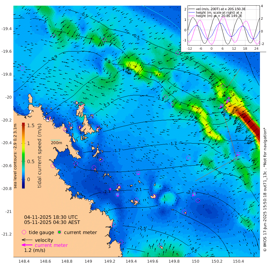 23cm/s 168T +10cm/s rms + 2cm/s 5T. Brampton I 18m 17cm/s -169T +9cm/s rms + 6cm/s 66T. Wigton I 38m 27cm/s -146T +7cm/s rms + 8cm/s 141T. Tern I 47m 40cm/s -148T +7cm/s rms + 12cm/s 54T. N Bugatti Rf 64m 38cm/s -135T +3cm/s rms + 13cm/s 178T. W Bugatti Rf 70m 22cm/s -130T +3cm/s rms + 3cm/s -130T. Creal Rf 69m -93cm Holbourne I -225cm Tern I -106cm Bugatti Rf -156cm Creal Rf -70cm White Tip I -83cm Wallaby Reef -66cm Kennedy Reef -48cm Unnamed Reef No. 2 -132cm Tideway Reef -119cm Hayman Island -176cm Square Reef -123cm Double Bay -157cm Molle Island -161cm Cid Harbour -126cm Hook Island -145cm Border Island -161cm Haslewood Island -157cm Shute Harbour -197cm Thomas Island -198cm Credlin Reef -220cm East Repulse Island -220cm Blacksmith Island -235cm Laguna Quays -222cm Carlisle Island (Off) -253cm St. Bees Island -230cm Scawfell Island -236cm Penrith Island -265cm Mackay Outer Harbour -281cm Hay Point -270cm Prudhoe Island