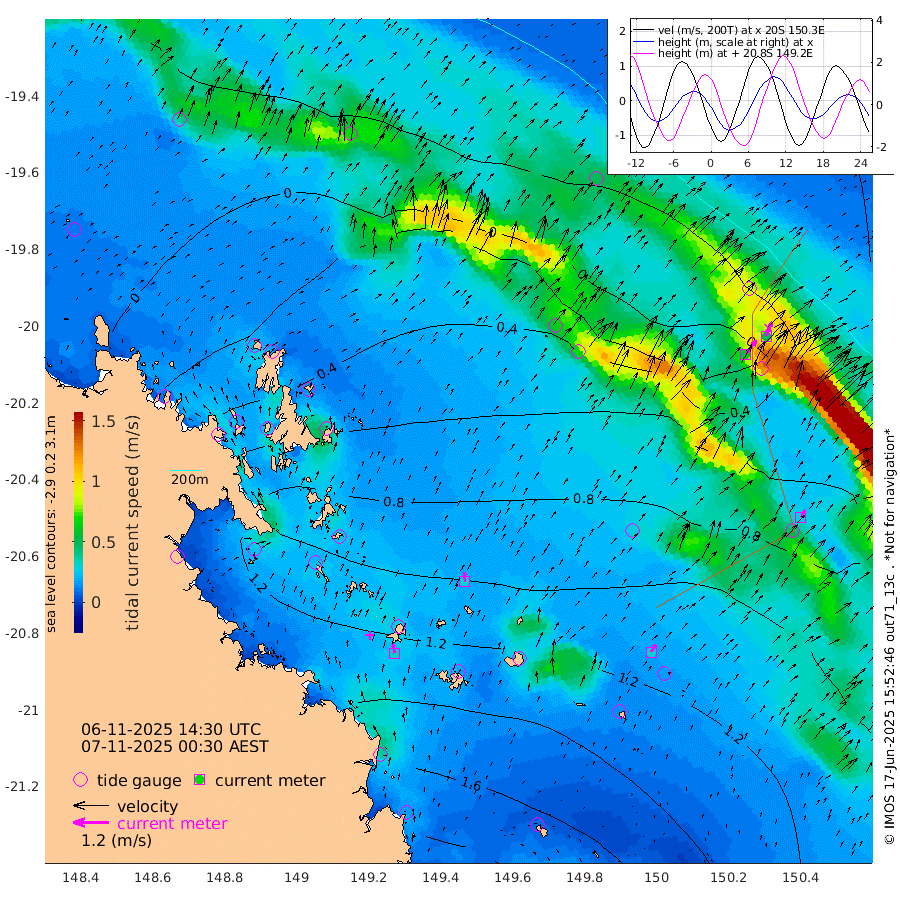 32cm/s -10T +10cm/s rms + 2cm/s 5T. Brampton I 18m 31cm/s -3T +9cm/s rms + 6cm/s 66T. Wigton I 38m 30cm/s 32T +7cm/s rms + 8cm/s 141T. Tern I 47m 51cm/s 22T +7cm/s rms + 12cm/s 54T. N Bugatti Rf 64m 58cm/s 37T +3cm/s rms + 13cm/s 178T. W Bugatti Rf 70m 28cm/s 31T +3cm/s rms + 3cm/s -130T. Creal Rf 69m -7cm Holbourne I 104cm Tern I 9cm Bugatti Rf 51cm Creal Rf -22cm White Tip I -19cm Wallaby Reef -32cm Kennedy Reef -43cm Unnamed Reef No. 2 26cm Tideway Reef 14cm Hayman Island 48cm Square Reef 14cm Double Bay 35cm Molle Island 48cm Cid Harbour 21cm Hook Island 43cm Border Island 58cm Haslewood Island 48cm Shute Harbour 86cm Thomas Island 77cm Credlin Reef 105cm East Repulse Island 100cm Blacksmith Island 121cm Laguna Quays 104cm Carlisle Island (Off) 118cm St. Bees Island 113cm Scawfell Island 109cm Penrith Island 144cm Mackay Outer Harbour 154cm Hay Point 141cm Prudhoe Island