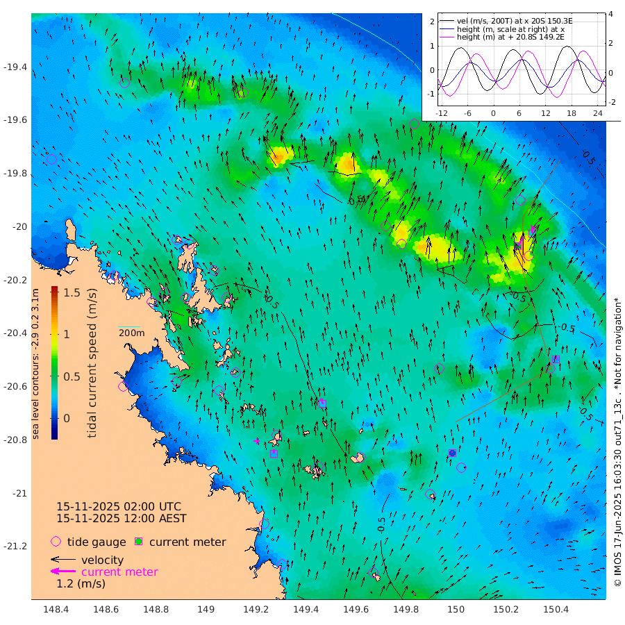 20cm/s -5T +10cm/s rms + 2cm/s 5T. Brampton I 18m 27cm/s -16T +9cm/s rms + 6cm/s 66T. Wigton I 38m 4cm/s 5T +7cm/s rms + 8cm/s 141T. Tern I 47m 33cm/s 5T +7cm/s rms + 12cm/s 54T. N Bugatti Rf 64m 50cm/s 29T +3cm/s rms + 13cm/s 178T. W Bugatti Rf 70m 16cm/s -9T +3cm/s rms + 3cm/s -130T. Creal Rf 69m -68cm Holbourne I -87cm Tern I -55cm Bugatti Rf -64cm Creal Rf -50cm White Tip I -53cm Wallaby Reef -60cm Kennedy Reef -56cm Unnamed Reef No. 2 -59cm Tideway Reef -68cm Hayman Island -69cm Square Reef -77cm Double Bay -56cm Molle Island -56cm Cid Harbour -66cm Hook Island -54cm Border Island -53cm Haslewood Island -64cm Shute Harbour -62cm Thomas Island -76cm Credlin Reef -68cm East Repulse Island -55cm Blacksmith Island -63cm Laguna Quays -76cm Carlisle Island (Off) -80cm St. Bees Island -67cm Scawfell Island -84cm Penrith Island -80cm Mackay Outer Harbour -88cm Hay Point -102cm Prudhoe Island