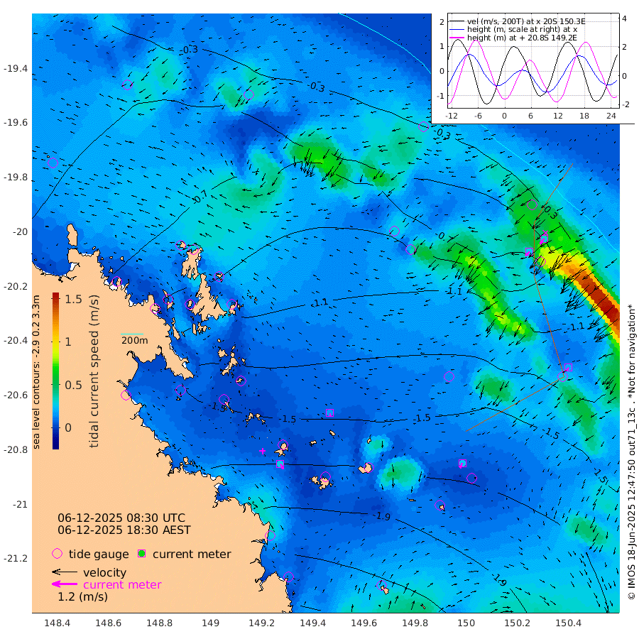 27cm/s 147T +10cm/s rms + 2cm/s 5T. Brampton I 18m 17cm/s 177T +9cm/s rms + 6cm/s 66T. Wigton I 38m 26cm/s -158T +7cm/s rms + 8cm/s 141T. Tern I 47m 31cm/s -147T +7cm/s rms + 12cm/s 54T. N Bugatti Rf 64m 25cm/s -135T +3cm/s rms + 13cm/s 178T. W Bugatti Rf 70m 19cm/s -143T +3cm/s rms + 3cm/s -130T. Creal Rf 69m -59cm Holbourne I -178cm Tern I -77cm Bugatti Rf -118cm Creal Rf -49cm White Tip I -46cm Wallaby Reef -35cm Kennedy Reef -33cm Unnamed Reef No. 2 -94cm Tideway Reef -87cm Hayman Island -121cm Square Reef -90cm Double Bay -105cm Molle Island -111cm Cid Harbour -91cm Hook Island -101cm Border Island -114cm Haslewood Island -113cm Shute Harbour -150cm Thomas Island -155cm Credlin Reef -174cm East Repulse Island -159cm Blacksmith Island -178cm Laguna Quays -173cm Carlisle Island (Off) -190cm St. Bees Island -173cm Scawfell Island -184cm Penrith Island -212cm Mackay Outer Harbour -227cm Hay Point -219cm Prudhoe Island