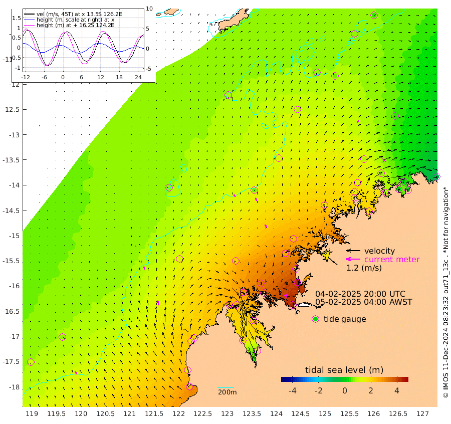 22cm/s -39T +10cm/s rms + 1cm/s 1T. NWSBRW 205m 26cm/s -23T +11cm/s rms + 6cm/s -110T. NWSROW 199m 30cm/s -28T +5cm/s rms + 2cm/s 65T. CAM050 58m 27cm/s -21T +12cm/s rms + 5cm/s 92T. CAM100 99m 7cm/s -3T +7cm/s rms + 1cm/s -85T. KIM400 396m 13cm/s -17T +9cm/s rms + 5cm/s -119T. KIM200 208m 26cm/s -20T +11cm/s rms + 5cm/s -147T. KIM100 99m 37cm/s -9T +8cm/s rms + 3cm/s -103T. KIM050 59m 19cm/s 41T +4cm/s rms + 2cm/s 23T. TIMORS88 91m 114cm Imperieuse Reef 71cm Mermaid Reef 230cm Broome 150cm Cape Baskerville 207cm Red Bluff 159cm Cape Boileau 66cm Scott Reef (WA) 84cm Ashmore Reef 275cm Karrakatta Bay 267cm Sunday Island 189cm Valentine Island 133cm Derby 221cm Port Usborne 287cm Bedford Islands 336cm Yampi Sound (Koolan Island) 342cm Macleay Island 201cm Adele Island 51cm Browse Island 425cm Shale Island 433cm Lizard Island 203cm Hall Point 267cm Degerando Island 237cm White Island 90cm Skua No. 4 Well 45cm Jabiru 170cm Maret Island 146cm Baudin Island 153cm Cape Voltaire (Krait Bay) 63cm Dillon Shoal 31cm Laminaria 167cm Port Warrender 72cm Troughton Island 128cm Cassini Island 81cm West Holothuria Reef Offshore 81cm Jar Island 131cm Lynher Bank 132cm Heywood Shoal 69cm Pee Shoal 31cm Van Cloon Shoal 13cm Carronade Island 13cm Guy Point 17cm Napier Broome Bay -89cm Lesueur Island