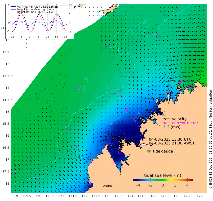 44cm/s 139T +10cm/s rms + 1cm/s 1T. NWSBRW 205m 43cm/s 150T +11cm/s rms + 6cm/s -110T. NWSROW 199m 71cm/s 154T +5cm/s rms + 2cm/s 65T. CAM050 58m 57cm/s 157T +12cm/s rms + 5cm/s 92T. CAM100 99m 11cm/s 155T +7cm/s rms + 1cm/s -85T. KIM400 396m 24cm/s 147T +9cm/s rms + 5cm/s -119T. KIM200 208m 48cm/s 153T +11cm/s rms + 5cm/s -147T. KIM100 99m 60cm/s 147T +8cm/s rms + 3cm/s -103T. KIM050 59m 39cm/s -127T +4cm/s rms + 2cm/s 23T. TIMORS88 91m -176cm Imperieuse Reef -78cm Mermaid Reef -225cm Broome -155cm Cape Baskerville -225cm Red Bluff -151cm Cape Boileau -74cm Scott Reef (WA) -118cm Ashmore Reef -363cm Karrakatta Bay -363cm Sunday Island -415cm Valentine Island -371cm Derby -412cm Port Usborne -356cm Bedford Islands -403cm Yampi Sound (Koolan Island) -401cm Macleay Island -233cm Adele Island -10cm Browse Island -529cm Shale Island -512cm Lizard Island -289cm Hall Point -304cm Degerando Island -255cm White Island -119cm Skua No. 4 Well -113cm Jabiru -188cm Maret Island -166cm Baudin Island -173cm Cape Voltaire (Krait Bay) -116cm Dillon Shoal -60cm Laminaria -200cm Port Warrender -129cm Troughton Island -156cm Cassini Island -110cm West Holothuria Reef Offshore -120cm Jar Island -146cm Lynher Bank -147cm Heywood Shoal -115cm Pee Shoal -76cm Van Cloon Shoal -45cm Carronade Island -46cm Guy Point -40cm Napier Broome Bay 30cm Lesueur Island
