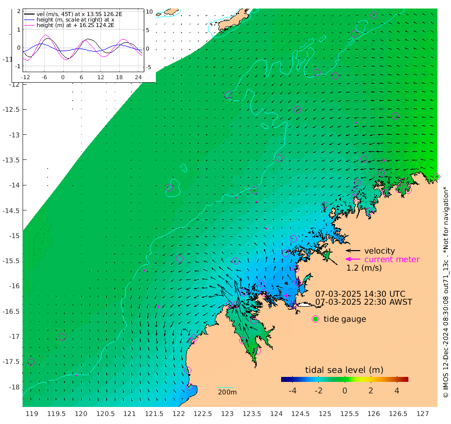 14cm/s 158T +10cm/s rms + 1cm/s 1T. NWSBRW 205m 11cm/s 172T +11cm/s rms + 6cm/s -110T. NWSROW 199m 13cm/s -165T +5cm/s rms + 2cm/s 65T. CAM050 58m 14cm/s -159T +12cm/s rms + 5cm/s 92T. CAM100 99m 5cm/s -137T +7cm/s rms + 1cm/s -85T. KIM400 396m 6cm/s -144T +9cm/s rms + 5cm/s -119T. KIM200 208m 12cm/s -159T +11cm/s rms + 5cm/s -147T. KIM100 99m 23cm/s -168T +8cm/s rms + 3cm/s -103T. KIM050 59m 19cm/s -109T +4cm/s rms + 2cm/s 23T. TIMORS88 91m -87cm Imperieuse Reef -84cm Mermaid Reef -179cm Broome -125cm Cape Baskerville -145cm Red Bluff -120cm Cape Boileau -76cm Scott Reef (WA) -86cm Ashmore Reef -189cm Karrakatta Bay -197cm Sunday Island -120cm Valentine Island -84cm Derby -146cm Port Usborne -208cm Bedford Islands -243cm Yampi Sound (Koolan Island) -241cm Macleay Island -156cm Adele Island -49cm Browse Island -295cm Shale Island -307cm Lizard Island -196cm Hall Point -193cm Degerando Island -188cm White Island -88cm Skua No. 4 Well -90cm Jabiru -139cm Maret Island -129cm Baudin Island -128cm Cape Voltaire (Krait Bay) -71cm Dillon Shoal -76cm Laminaria -136cm Port Warrender -79cm Troughton Island -107cm Cassini Island -86cm West Holothuria Reef Offshore -81cm Jar Island -123cm Lynher Bank -123cm Heywood Shoal -75cm Pee Shoal -48cm Van Cloon Shoal -41cm Carronade Island -48cm Guy Point -39cm Napier Broome Bay 15cm Lesueur Island