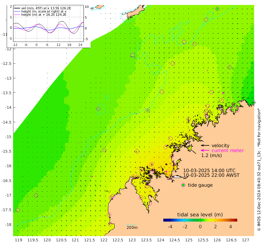 8cm/s -31T +10cm/s rms + 1cm/s 1T. NWSBRW 205m 11cm/s -17T +11cm/s rms + 6cm/s -110T. NWSROW 199m 7cm/s -5T +5cm/s rms + 2cm/s 65T. CAM050 58m 8cm/s -8T +12cm/s rms + 5cm/s 92T. CAM100 99m 3cm/s -10T +7cm/s rms + 1cm/s -85T. KIM400 396m 6cm/s -10T +9cm/s rms + 5cm/s -119T. KIM200 208m 12cm/s -7T +11cm/s rms + 5cm/s -147T. KIM100 99m 16cm/s 6T +8cm/s rms + 3cm/s -103T. KIM050 59m 10cm/s 14T +4cm/s rms + 2cm/s 23T. TIMORS88 91m 71cm Imperieuse Reef 49cm Mermaid Reef 119cm Broome 93cm Cape Baskerville 97cm Red Bluff 104cm Cape Boileau 56cm Scott Reef (WA) 70cm Ashmore Reef 138cm Karrakatta Bay 134cm Sunday Island 124cm Valentine Island 102cm Derby 128cm Port Usborne 148cm Bedford Islands 152cm Yampi Sound (Koolan Island) 205cm Macleay Island 128cm Adele Island 58cm Browse Island 180cm Shale Island 163cm Lizard Island 121cm Hall Point 141cm Degerando Island 111cm White Island 81cm Skua No. 4 Well 66cm Jabiru 114cm Maret Island 91cm Baudin Island 103cm Cape Voltaire (Krait Bay) 75cm Dillon Shoal 34cm Laminaria 115cm Port Warrender 91cm Troughton Island 106cm Cassini Island 78cm West Holothuria Reef Offshore 69cm Jar Island 74cm Lynher Bank 89cm Heywood Shoal 81cm Pee Shoal 59cm Van Cloon Shoal 51cm Carronade Island 54cm Guy Point 59cm Napier Broome Bay 12cm Lesueur Island