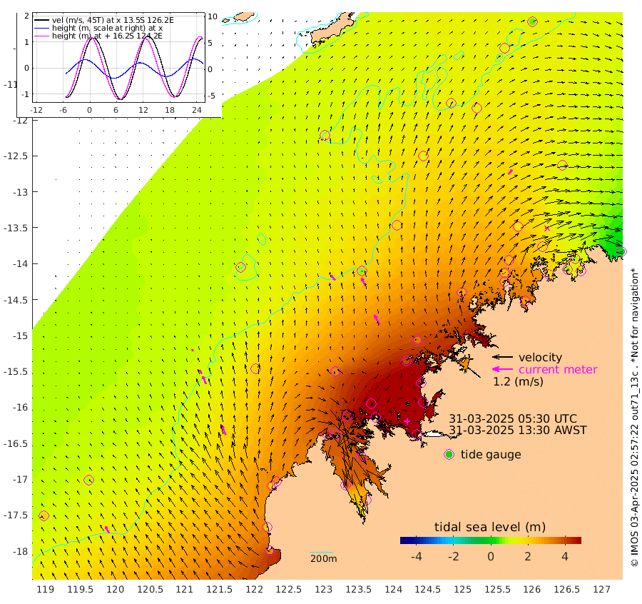 38cm/s -41T +10cm/s rms + 1cm/s 1T. NWSBRW 205m 46cm/s -27T +11cm/s rms + 6cm/s -110T. NWSROW 199m 64cm/s -28T +5cm/s rms + 2cm/s 65T. CAM050 58m 53cm/s -23T +12cm/s rms + 5cm/s 92T. CAM100 99m 12cm/s -23T +7cm/s rms + 1cm/s -85T. KIM400 396m 25cm/s -27T +9cm/s rms + 5cm/s -119T. KIM200 208m 50cm/s -23T +11cm/s rms + 5cm/s -147T. KIM100 99m 62cm/s -24T +8cm/s rms + 3cm/s -103T. KIM050 59m 34cm/s 41T +4cm/s rms + 2cm/s 23T. TIMORS88 91m 199cm Imperieuse Reef 102cm Mermaid Reef 314cm Broome 221cm Cape Baskerville 305cm Red Bluff 218cm Cape Boileau 95cm Scott Reef (WA) 151cm Ashmore Reef 423cm Karrakatta Bay 402cm Sunday Island 404cm Valentine Island 320cm Derby 401cm Port Usborne 429cm Bedford Islands 490cm Yampi Sound (Koolan Island) 497cm Macleay Island 302cm Adele Island 67cm Browse Island 620cm Shale Island 599cm Lizard Island 413cm Hall Point 393cm Degerando Island 336cm White Island 150cm Skua No. 4 Well 141cm Jabiru 267cm Maret Island 240cm Baudin Island 242cm Cape Voltaire (Krait Bay) 126cm Dillon Shoal 54cm Laminaria 284cm Port Warrender 184cm Troughton Island 229cm Cassini Island 158cm West Holothuria Reef Offshore 173cm Jar Island 187cm Lynher Bank 184cm Heywood Shoal 143cm Pee Shoal 107cm Van Cloon Shoal 84cm Carronade Island 75cm Guy Point 84cm Napier Broome Bay -7cm Lesueur Island