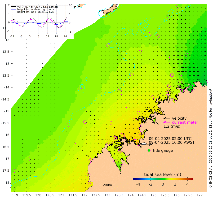 5cm/s -5T +10cm/s rms + 1cm/s 1T. NWSBRW 205m 10cm/s 1T +11cm/s rms + 6cm/s -110T. NWSROW 199m 8cm/s 75T +5cm/s rms + 2cm/s 65T. CAM050 58m 7cm/s 59T +12cm/s rms + 5cm/s 92T. CAM100 99m 3cm/s 42T +7cm/s rms + 1cm/s -85T. KIM400 396m 6cm/s 33T +9cm/s rms + 5cm/s -119T. KIM200 208m 12cm/s 26T +11cm/s rms + 5cm/s -147T. KIM100 99m 18cm/s 31T +8cm/s rms + 3cm/s -103T. KIM050 59m 16cm/s 75T +4cm/s rms + 2cm/s 23T. TIMORS88 91m 68cm Imperieuse Reef 66cm Mermaid Reef 162cm Broome 124cm Cape Baskerville 144cm Red Bluff 117cm Cape Boileau 68cm Scott Reef (WA) 79cm Ashmore Reef 154cm Karrakatta Bay 151cm Sunday Island 108cm Valentine Island 51cm Derby 107cm Port Usborne 196cm Bedford Islands 194cm Yampi Sound (Koolan Island) 240cm Macleay Island 160cm Adele Island 69cm Browse Island 220cm Shale Island 218cm Lizard Island 133cm Hall Point 176cm Degerando Island 147cm White Island 90cm Skua No. 4 Well 61cm Jabiru 141cm Maret Island 110cm Baudin Island 118cm Cape Voltaire (Krait Bay) 57cm Dillon Shoal 51cm Laminaria 129cm Port Warrender 81cm Troughton Island 120cm Cassini Island 81cm West Holothuria Reef Offshore 59cm Jar Island 101cm Lynher Bank 102cm Heywood Shoal 86cm Pee Shoal 43cm Van Cloon Shoal 27cm Carronade Island 26cm Guy Point 27cm Napier Broome Bay -36cm Lesueur Island