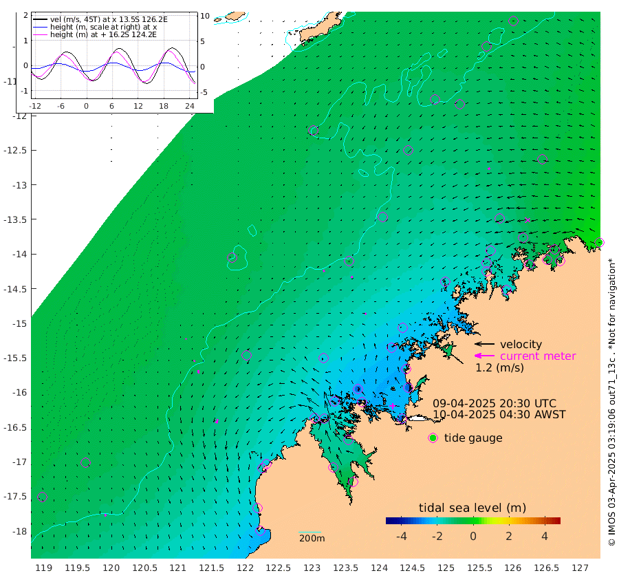 11cm/s 153T +10cm/s rms + 1cm/s 1T. NWSBRW 205m 14cm/s 167T +11cm/s rms + 6cm/s -110T. NWSROW 199m 10cm/s -149T +5cm/s rms + 2cm/s 65T. CAM050 58m 11cm/s -160T +12cm/s rms + 5cm/s 92T. CAM100 99m 4cm/s -157T +7cm/s rms + 1cm/s -85T. KIM400 396m 7cm/s -170T +9cm/s rms + 5cm/s -119T. KIM200 208m 17cm/s -173T +11cm/s rms + 5cm/s -147T. KIM100 99m 25cm/s -162T +8cm/s rms + 3cm/s -103T. KIM050 59m 15cm/s -128T +4cm/s rms + 2cm/s 23T. TIMORS88 91m -100cm Imperieuse Reef -86cm Mermaid Reef -217cm Broome -167cm Cape Baskerville -207cm Red Bluff -175cm Cape Boileau -87cm Scott Reef (WA) -103cm Ashmore Reef -220cm Karrakatta Bay -216cm Sunday Island -147cm Valentine Island -75cm Derby -141cm Port Usborne -254cm Bedford Islands -268cm Yampi Sound (Koolan Island) -306cm Macleay Island -205cm Adele Island -86cm Browse Island -306cm Shale Island -307cm Lizard Island -204cm Hall Point -241cm Degerando Island -208cm White Island -114cm Skua No. 4 Well -93cm Jabiru -185cm Maret Island -158cm Baudin Island -165cm Cape Voltaire (Krait Bay) -87cm Dillon Shoal -58cm Laminaria -192cm Port Warrender -118cm Troughton Island -162cm Cassini Island -118cm West Holothuria Reef Offshore -103cm Jar Island -133cm Lynher Bank -145cm Heywood Shoal -110cm Pee Shoal -79cm Van Cloon Shoal -63cm Carronade Island -65cm Guy Point -75cm Napier Broome Bay 9cm Lesueur Island