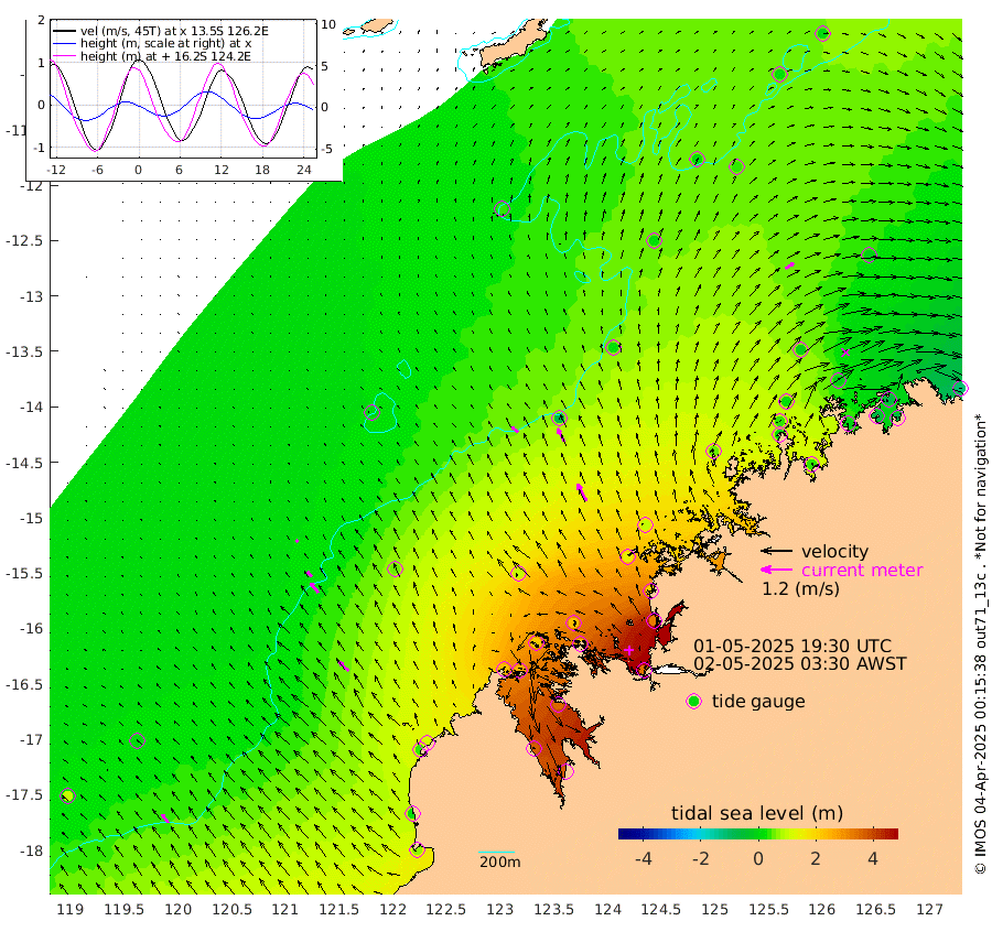 32cm/s -48T +10cm/s rms + 1cm/s 1T. NWSBRW 205m 41cm/s -36T +11cm/s rms + 6cm/s -110T. NWSROW 199m 75cm/s -29T +5cm/s rms + 2cm/s 65T. CAM050 58m 56cm/s -28T +12cm/s rms + 5cm/s 92T. CAM100 99m 10cm/s -37T +7cm/s rms + 1cm/s -85T. KIM400 396m 25cm/s -42T +9cm/s rms + 5cm/s -119T. KIM200 208m 47cm/s -38T +11cm/s rms + 5cm/s -147T. KIM100 99m 52cm/s -46T +8cm/s rms + 3cm/s -103T. KIM050 59m 38cm/s 55T +4cm/s rms + 2cm/s 23T. TIMORS88 91m 100cm Imperieuse Reef 4cm Mermaid Reef 67cm Broome 34cm Cape Baskerville 108cm Red Bluff 26cm Cape Boileau 2cm Scott Reef (WA) 32cm Ashmore Reef 238cm Karrakatta Bay 250cm Sunday Island 366cm Valentine Island 363cm Derby 355cm Port Usborne 217cm Bedford Islands 225cm Yampi Sound (Koolan Island) 226cm Macleay Island 105cm Adele Island -69cm Browse Island 333cm Shale Island 316cm Lizard Island 207cm Hall Point 142cm Degerando Island 97cm White Island 24cm Skua No. 4 Well 34cm Jabiru 49cm Maret Island 36cm Baudin Island 25cm Cape Voltaire (Krait Bay) 30cm Dillon Shoal 2cm Laminaria 35cm Port Warrender -2cm Troughton Island 15cm Cassini Island -4cm West Holothuria Reef Offshore -4cm Jar Island 46cm Lynher Bank 19cm Heywood Shoal 25cm Pee Shoal -14cm Van Cloon Shoal -62cm Carronade Island -65cm Guy Point -69cm Napier Broome Bay -116cm Lesueur Island